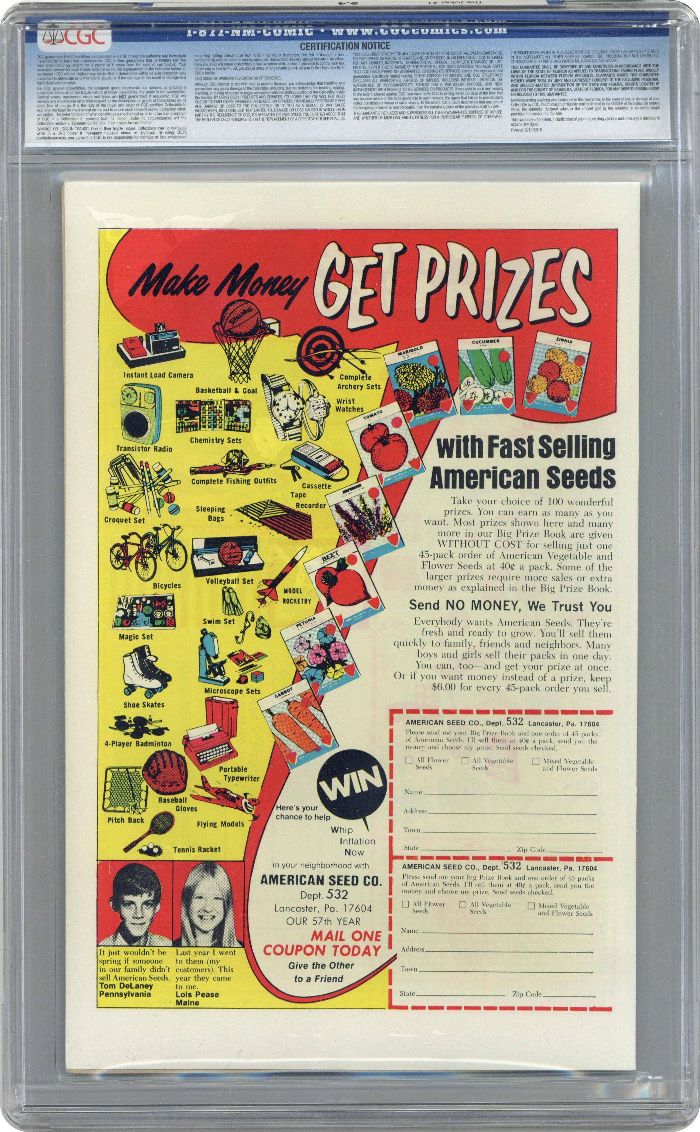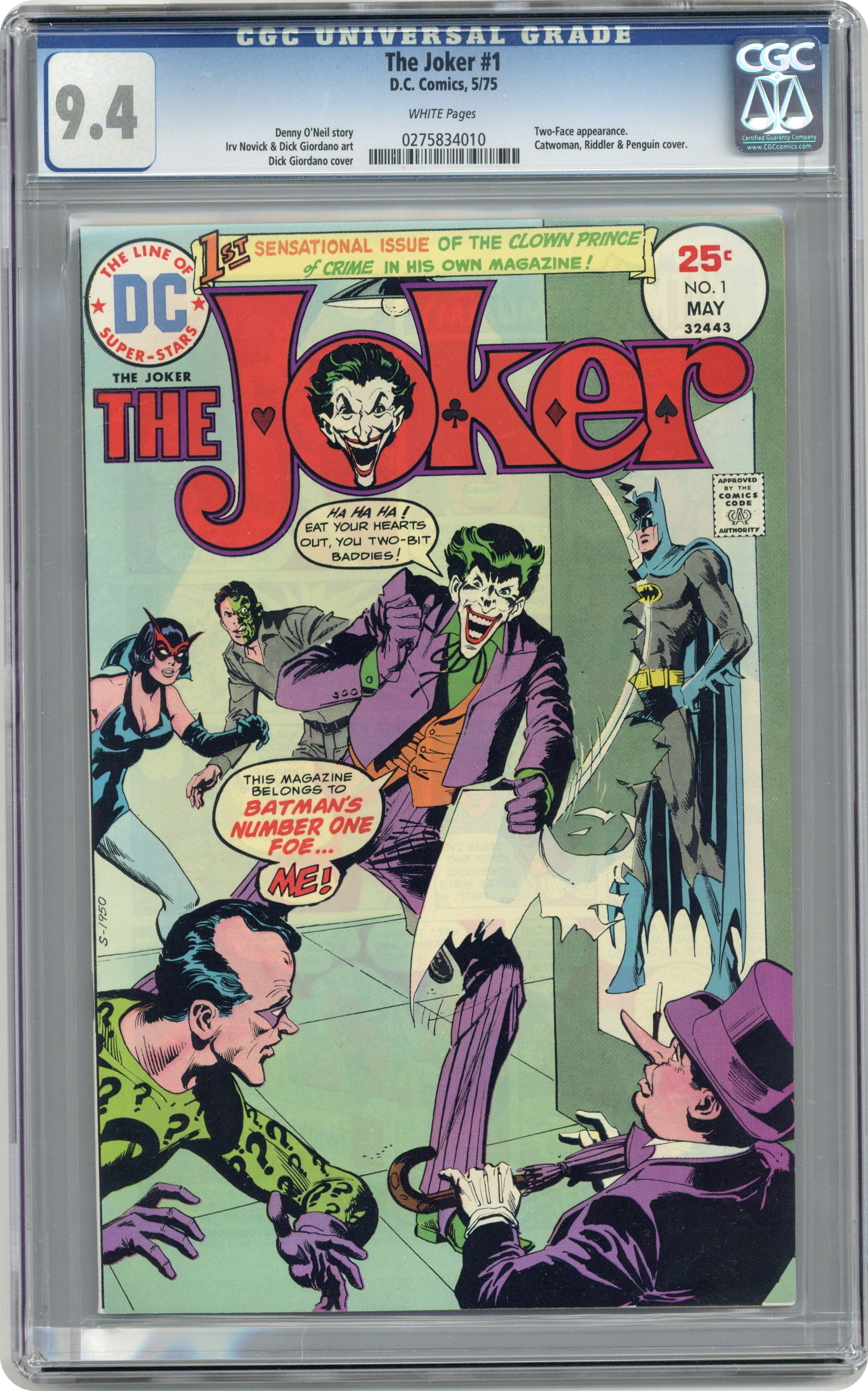 Ended May 8 2020 Winning Bid $185 Cover by Dick Giordano. "The Joker's Double Jeopardy!," script by Denny O'Neil, pencils by Irv Novick, inks by Dick Giordano; When a new criminal breaks Two-Face out of Arkham Asylum, claiming that he has need of "a truly master criminal", the Joker is incensed; Soon, the Clown Prince of Crime stages his own breakout and tracks down Two-Face, determined to show just who Gotham's number-one criminal truly is. Article on the creation of the Joker. Hostess Twinkies ad with Batman. 36 pgs., full color. $0.25. Cover price $0.25. Grade: CGC 9.4 explanation of grade Condition: Used (collectible)