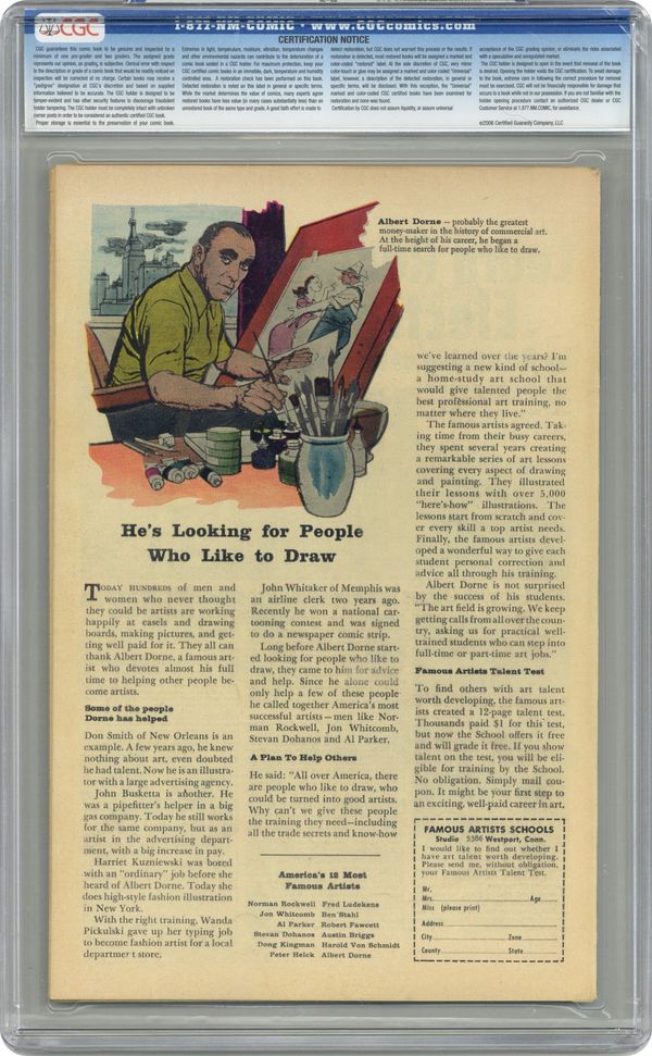 Ended May 13 2020 Winning Bid $137 Cover pencils by Jack Kirby, inks by Dick Ayers. "The Thing in the Black Box!," pencils by Jack Kirby; A shipwrecked man meets the legendary Pandora, who tricks him into releasing the demons from her box. "The Remedy Oil" text story, art by Marie Severin. "Midnight in the Wax Museum," pencils by Jack Kirby; An artist falls asleep in a wax museum and after midnight he is awoken by a sound; When he investigates, he finds that the wax figures are really aliens who are observing humans. "The Mechanical Men!," script by Stan Lee, art by Steve Ditko; An alien plot to infiltrate Earth with robotic dolls is unwittingly foiled by a police officer trying to get rid of peddlers. "Forever Is a Long Long Time!," art by Don Heck; A greedy businessman bullies a scientist into giving him a device that can give humans the 1,000-year lifespan of a giant redwood. 36 pgs., full color. $0.10. Cover price $0.10. Grade: CGC 6.5 explanation of grade Condition: Used (collectible)