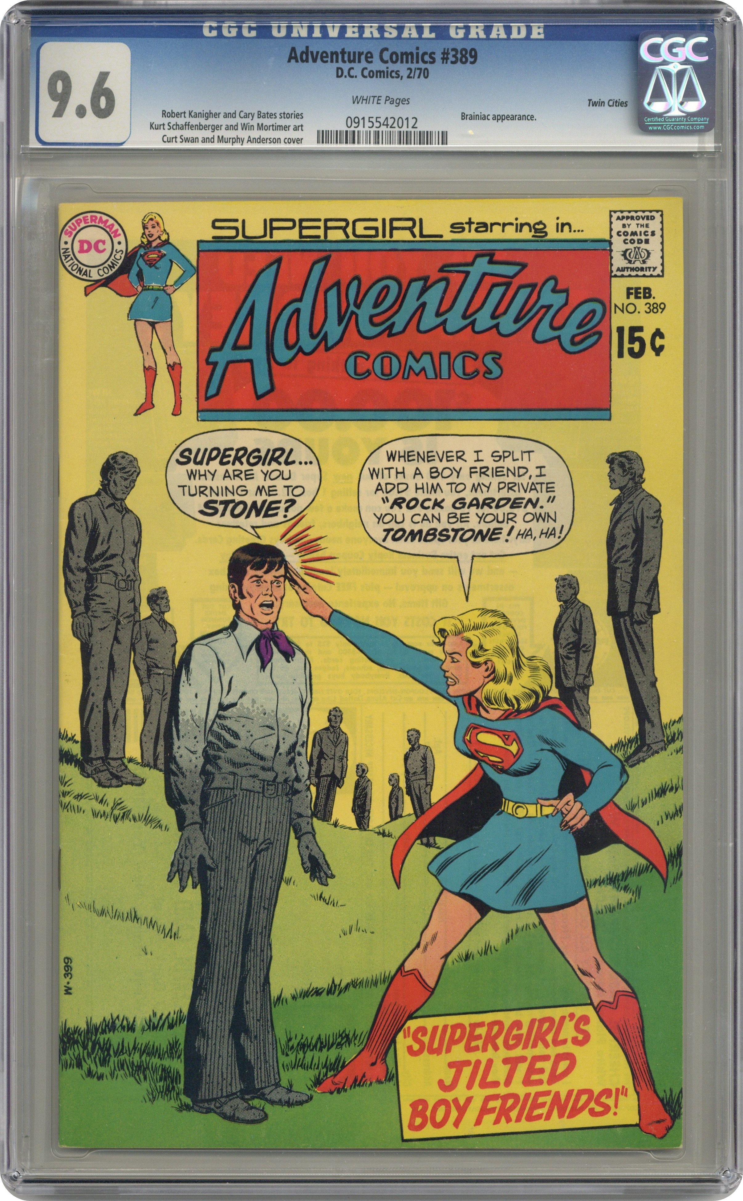 Ended May 12 2020 Winning Bid $111 Cover pencils by Curt Swan, inks by Murphy Anderson. The Mystery Magician starring Supergirl, Malcolm the Mysterious, Zor-El and Alura (flashback), and Fred Danvers, script by Robert Kanigher, art by Win Mortimer. Supergirl's Jilted Boy Friends!, script by Cary Bates, art by Kurt Schaffenberger; Supergirl battles Brainiac. 36 Pages, Full Color. Cover price $0.15. Grade: CGC 9.6 explanation of grade Condition: Used (collectible)