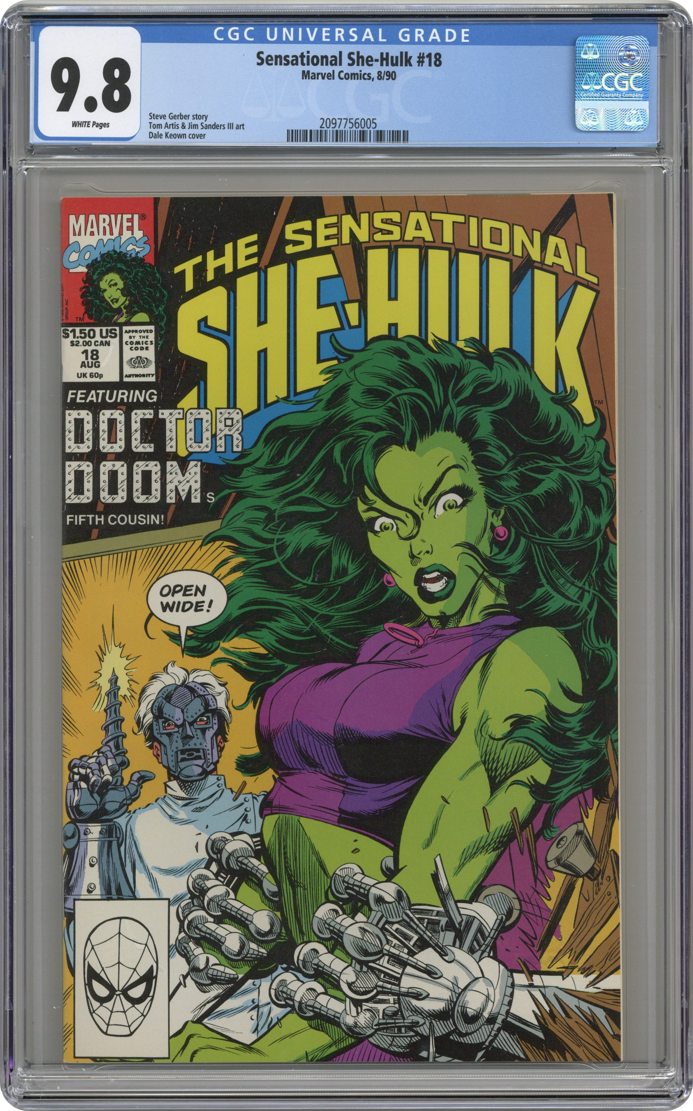 Ended May 6 2020 Winning Bid $30 Cover art by Dale Keown. The Dentist In the Iron Mask, script by Steve Gerber, pencils by Tom Artis, inks by Jim Sanders III; She-Hulk battles dentist Dr. Bob Doom, Doctor Doom's fifth cousin. 36 pgs. $1.50. Cover price $1.50. Grade: CGC 9.8 explanation of grade Condition: Used (collectible)