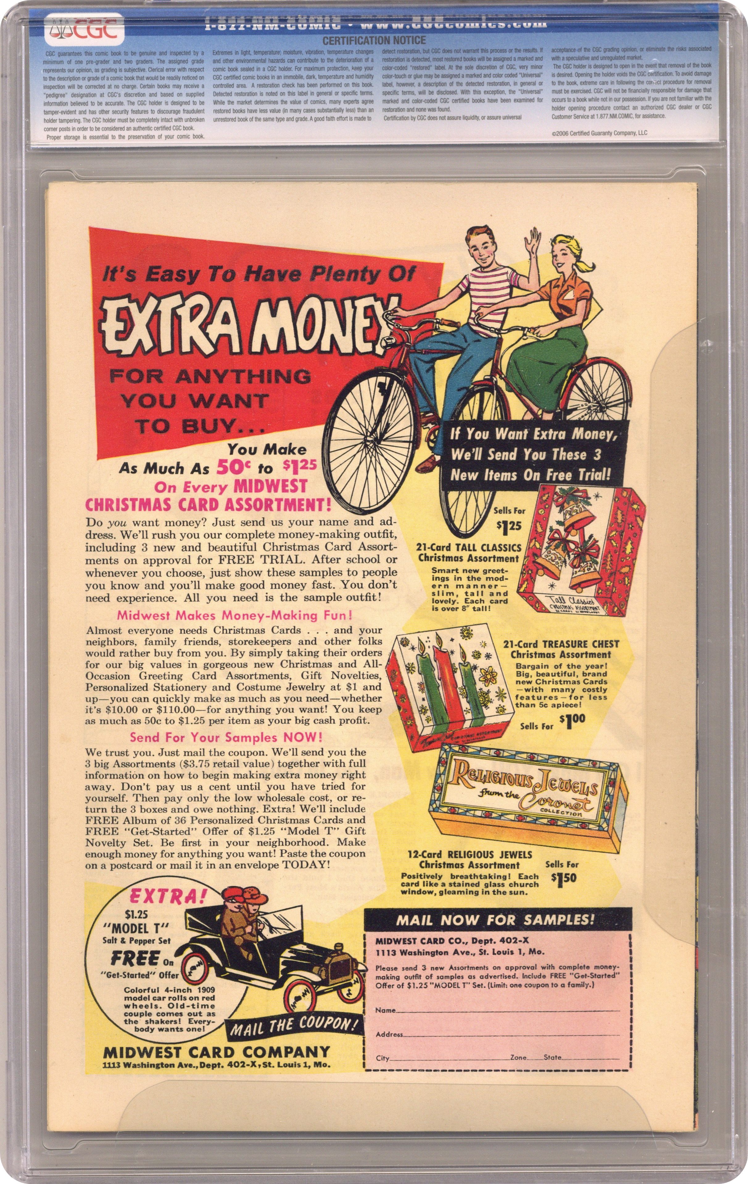 Ended May 5 2020 Winning Bid $100 Cover pencils by Curt Swan, inks by Stan Kaye. The Day Superman Betrayed Batman, script by Bill Finger, pencils by Dick Sprang, inks by Stan Kaye; The Condor Gang frames Batman for taking a bribe to let a criminal escape. Superman is forced to arrest Batman and Robin and then spends his time trying to prove their innocence, giving the Condor Gang a chance to start a crime spree. Lost: A Free Education public service announcement starring Binky, script by Jack Schiff, art by Bob Oksner. The Strange Journal of Old Blue Jay starring Tomahawk, script by Dave Wood, art by Fred Ray. Ollie humor page by Henry Boltinoff. Menace of the Mechanical Octopus starring Green Arrow, script by Ed Herron, pencils by Jack Kirby, inks b Jack Kirby and Roz Kirby (backgrounds); Crooks are using a mechanical octopus to commit robberies. 36 Pages, Full Color. Cover price $0.10. Grade: CGC 8.0 explanation of grade Condition: Used (collectible)