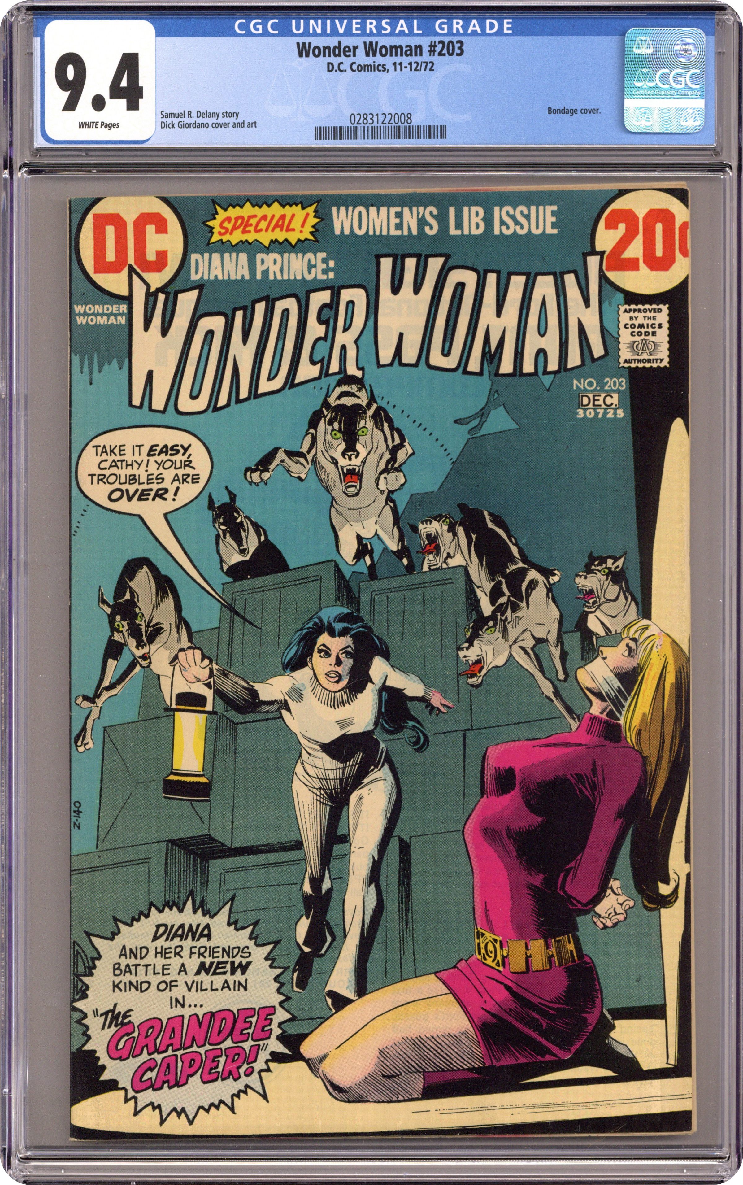 Ended May 10 2020 Winning Bid $305 Cover by Dick Giordano. Womens lib story "The Grandee Caper," script by Samuel R. Delany, art by Dick Giordano; After Cathy Perkins starts a fight with some wolfish "admirers" of Diana (and Diana ends it), the now-homeless Diana moves in with her former assistant, whom she learns is now enrolled in a womens liberation group and is taking karate lessons; Diana is offered a job at Grandees Department Store by Mr. Grandee, its owner, who wishes to pay her big bucks for appearing in ads for his store as the symbol of the new liberated woman. 36 pages, Full Color. Cover price $0.20. Grade: CGC 9.4 explanation of grade Condition: Used (collectible)