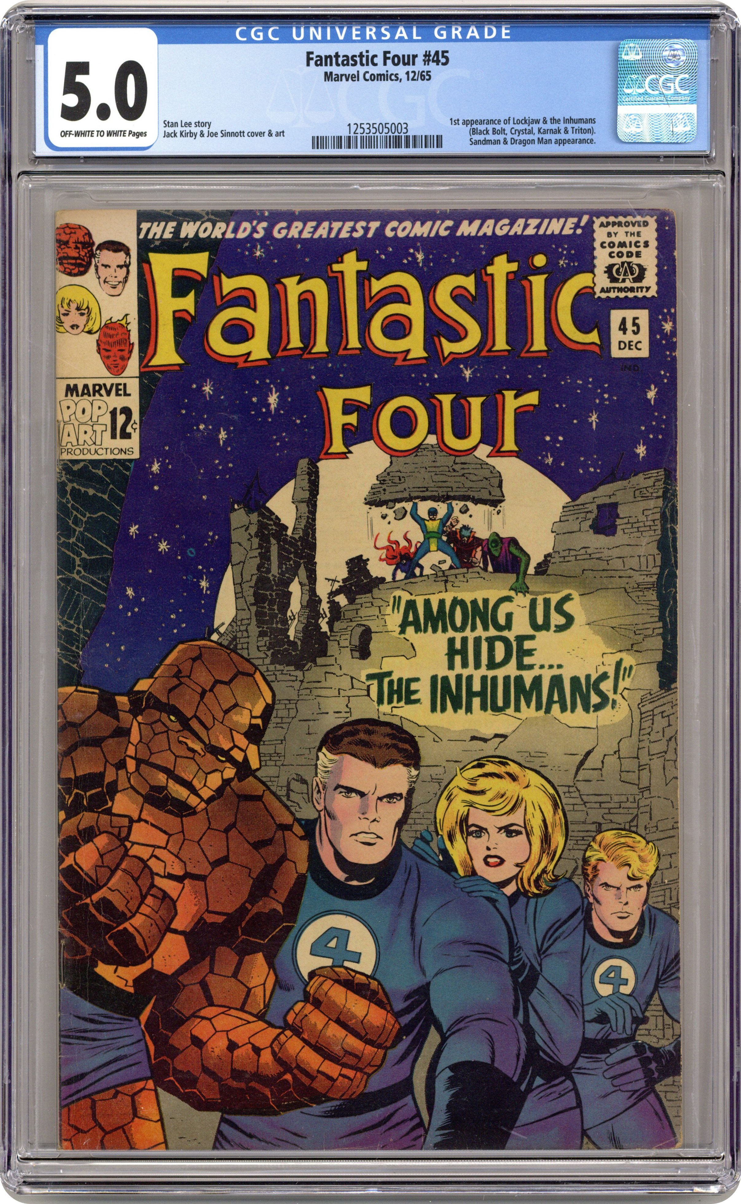 Ended May 6 2020 Winning Bid $283 Cover pencils by Jack Kirby, inks by Joe Sinnott. First appearance of the Inhumans--Black Bolt, Crystal, Karnak, Triton, and Lockjaw—in Among Us Hide...the Inhumans, script by Stan Lee, pencils by Jack Kirby, inks by Joe Sinnott; Crystal lures Johnny into a trap where he is captured by the Inhumans; The rest of the FF hurry to his rescue. Appearances by Medusa, Gorgon, the Dragon Man, the Sandman, and the Trapster. 36 pgs. Cover price $0.12. Grade: CGC 5.0 explanation of grade Condition: Used (collectible)