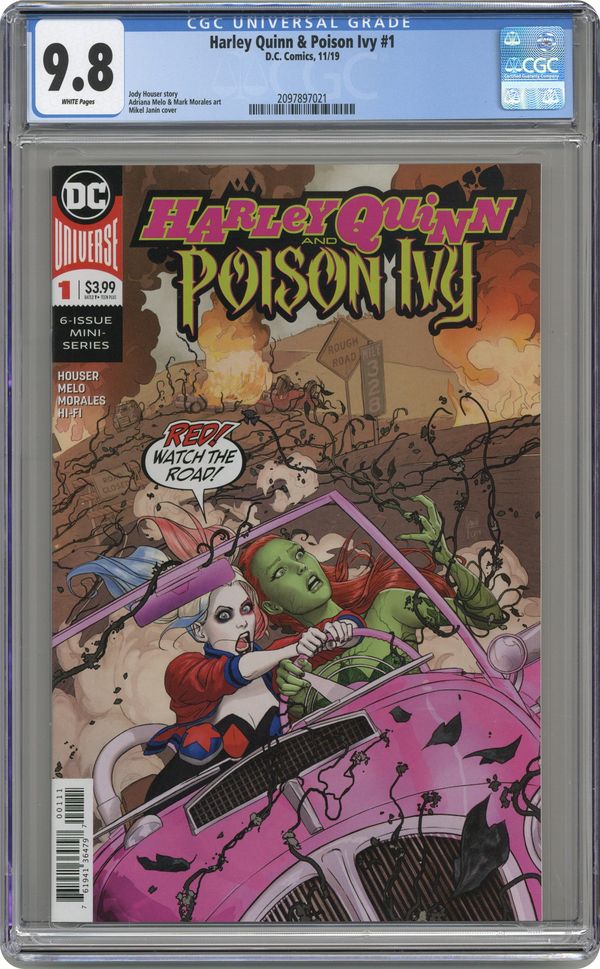 Ended May 7 2020 Winning Bid $27 Written by Jody Houser. Art by Adriana Melo. Cover by Elena Casagrande. Harley Quinn and Poison Ivy are taking their show on the road in this new miniseries! They'll have to evade villains and heroes alike while they explore their relationship and unpack their time and experiences at Sanctuary. Set after the events of HEROES IN CRISIS and smack in the middle of 'Year of the Villain,' it's a journey across the DC Universe that will change their friendship forever...if they live that long! 32 pages, full color. Rated T+ Cover price $3.99. Grade: CGC 9.8 explanation of grade Condition: Used (collectible)