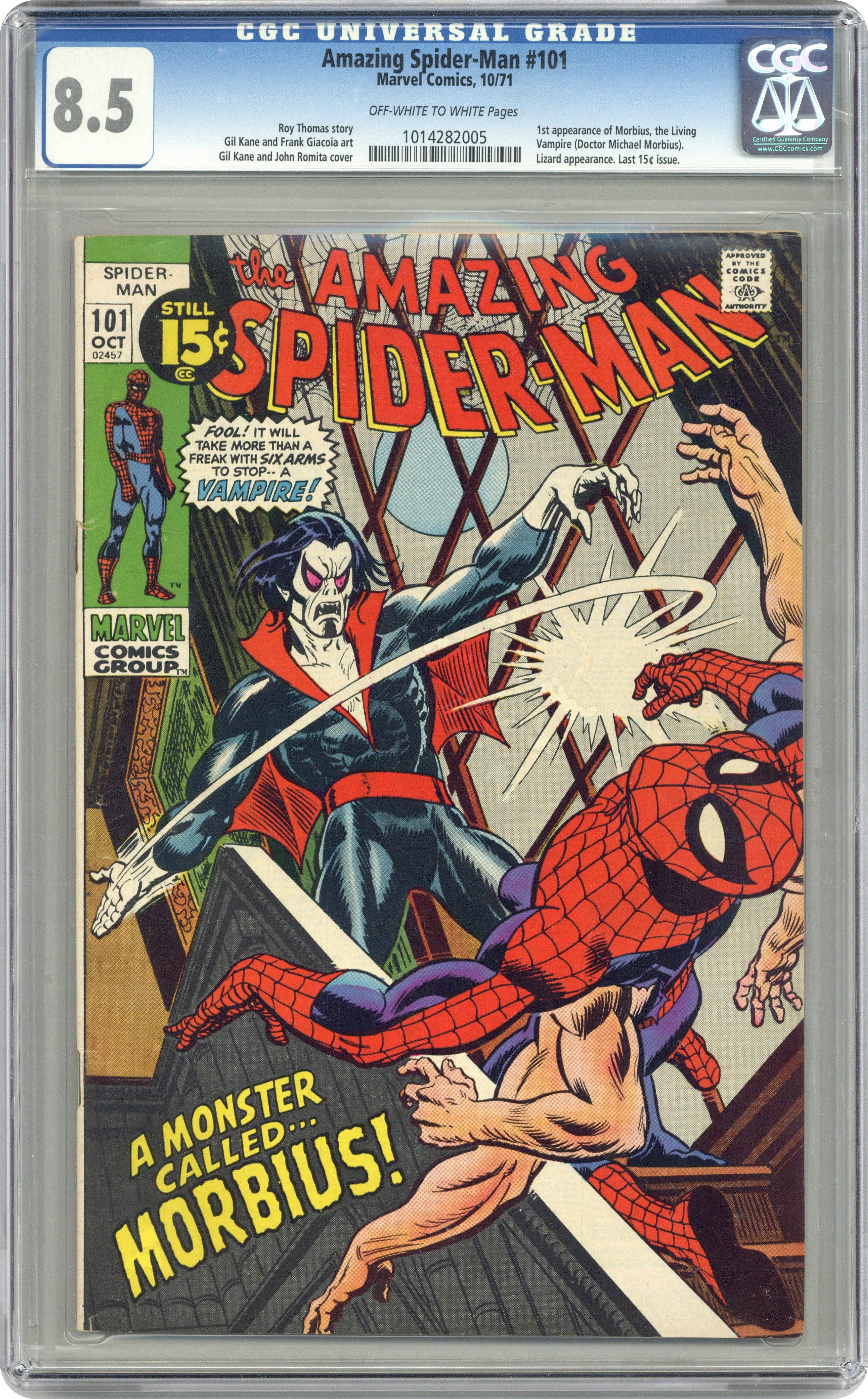 Ended May 6 2020 Winning Bid $761 First appearance of Morbius the Living Vampire in "A Monster Called Morbius!" Script by Roy Thomas. Pencils by Gil Kane. Inks by Frank Giacoia. Cover by Gil Kane and John Romita. The first 100 issues of the Amazing Spider-Man title are in the books! And the next chapter in the web-slinger's anthology kicks off with the debut of Marvel's first bronze age vampire: Morbius! However, at the moment Peter Parker has a much bigger problem on his (six) hands. After drinking the special potion he developed, Aunt May's nephew grew four additional arms! Oh, my goodness! Peter is desperate to find a way to remove the arms, so he calls Dr. Curt Connors for help. Dr. Connors has a summer house and laboratory in Southampton on Long Island...and he gives Spider-Man permission to stay there and work on a cure. Meanwhile, a strange, pale, and bloodthirsty man is the sole survivor of a shipwreck near Southampton. And he's looking for a quiet place to rest. Oh no. Is the six-armed Spider-Man on a collision course with a living vampire? Oh yes! Cameo appearances by Gwen Stacy, J. Jonah Jameson, Joe Robertson, and the Lizard. Last 15ยข cover price. (Notes: This is the first issue of the Amazing Spider-Man series not written by Stan Lee. There exists a second printing of this issue published in 1992 with a silver background cover. Marvel also published a facsimile edition of Amazing Spider-Man 101 in 2021.) 36 pages. Cover price $0.15. Grade: CGC 8.5 explanation of grade Condition: Used (collectible)