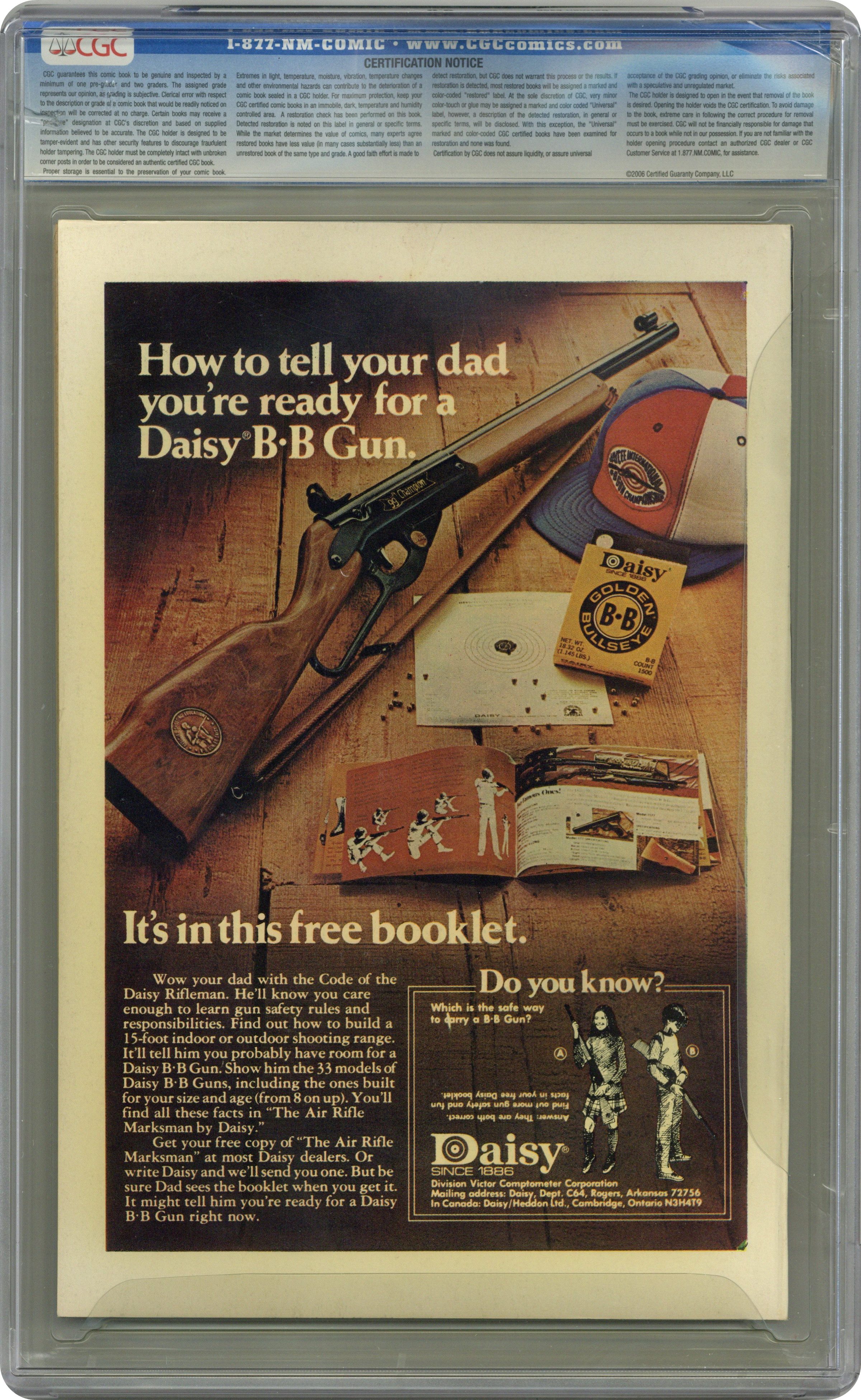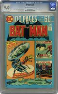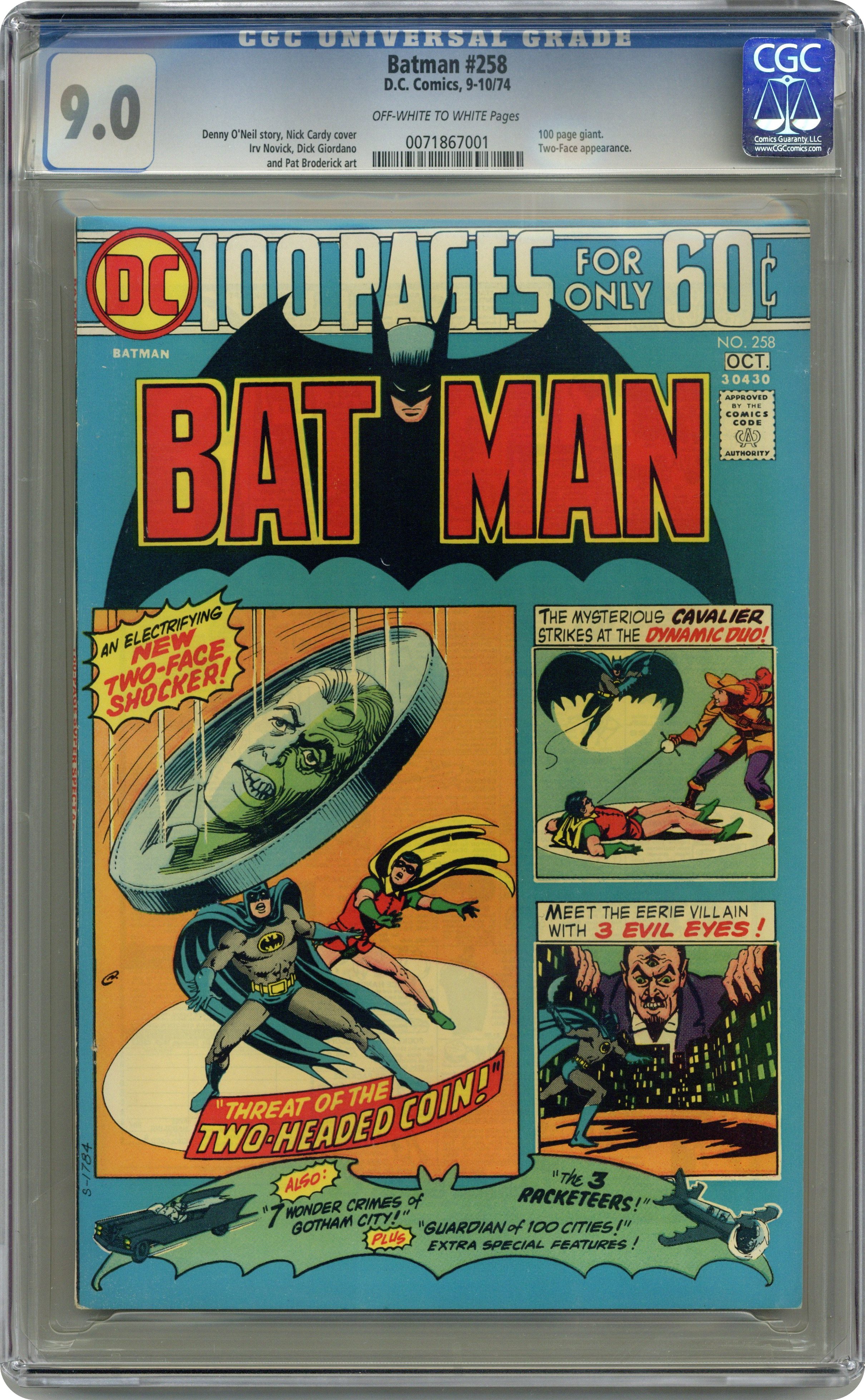 Ended May 5 2020 Winning Bid $155 100-page giant. Cover by Nick Cardy. Two-Face is back in a new story, "Threat of the Two-Headed Coin!", script by Denny O'Neil, pencils by Irv Novick, inks by Dick Giordano; Two-Face returns, having devised a plan to extort $2 billion from the citizens of the U.S.; If the government refuses to pay, the criminal plans to destroy the government...forever! Bat-Puzzle activity page by Bob Rozakis, pencils by Carmine Infantino, inks by Murphy Anderson. "The Three Racketeers!", script by Bill Finger, pencils by Bob Kane, inks by Jerry Robinson and George Roussos; Three former racketeers sit about a table playing cards in prison discussing how the Batman and Robin brought their dreams of easy wealth to a disastrous end. "7 Wonder Crimes of Gotham City!", script by Gardner F. Fox, pencils by Sheldon Moldoff (as Bob Kane), inks by Joe Giella; The Dynamic Duo face an opponent out to commit the "Seven Wonder Crimes of Gotham City." "Twenty-Ton Robbery!", script by Don Cameron, art by Dick Sprang (as Bob Kane); The Cavalier returns in disguise to acquire a new mob that he plans to use to rob the city blind, but the theft of a whale undoes his plans. "The Guardian of 100 Cities!" script by Bill Finger, pencils by Sheldon Moldoff, inks by Charles Paris; Famed replica artifacts from various movie sets, located in a field not far from Hollywood, serve as the stage as a hideout for escaped convict Shag Darnell and his thugs. "The Man with a Thousand Eyes!", script by Bill Finger, pencils by Bob Kane, inks by Charles Paris; Count Florian, a criminal Batman and Robin once battled in London, comes to America and successfully steals a civilian invention in order to spy on America. 100 Pages, Full Color. Cover price $0.60. Grade: CGC 9.0 explanation of grade Condition: Used (collectible)