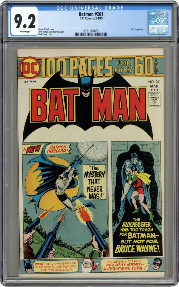 Ended May 7 2020 Winning Bid $47 100-page giant. This issue's collection of new material and reprints features Batman's "secret weapons." Cover by Nick Cardy. New Batman story titled "The Mystery That Never Was!" (script by Denny O'Neil, pencils by Irv Novick, inks by Dick Giordano). Reprints: "The Great Batman Contest!" (from 1956), "Crime's Manhunt!" (art by Dick Sprang; from 1944), "The 1,001 Inventions of Batman!" (art by Sprang; from 1957), "A Christmas Peril!" (art by Jerry Robinson; from 1944), "The Block-Buster Invaion of Gothan City!" (script by Gardner Fox, pencils by Carmine Infantino, inks by Joe Giella; from the 1960s). 100 Pages, Full Color. Cover price $0.60. Grade: CGC 9.2 explanation of grade Condition: Used (collectible)