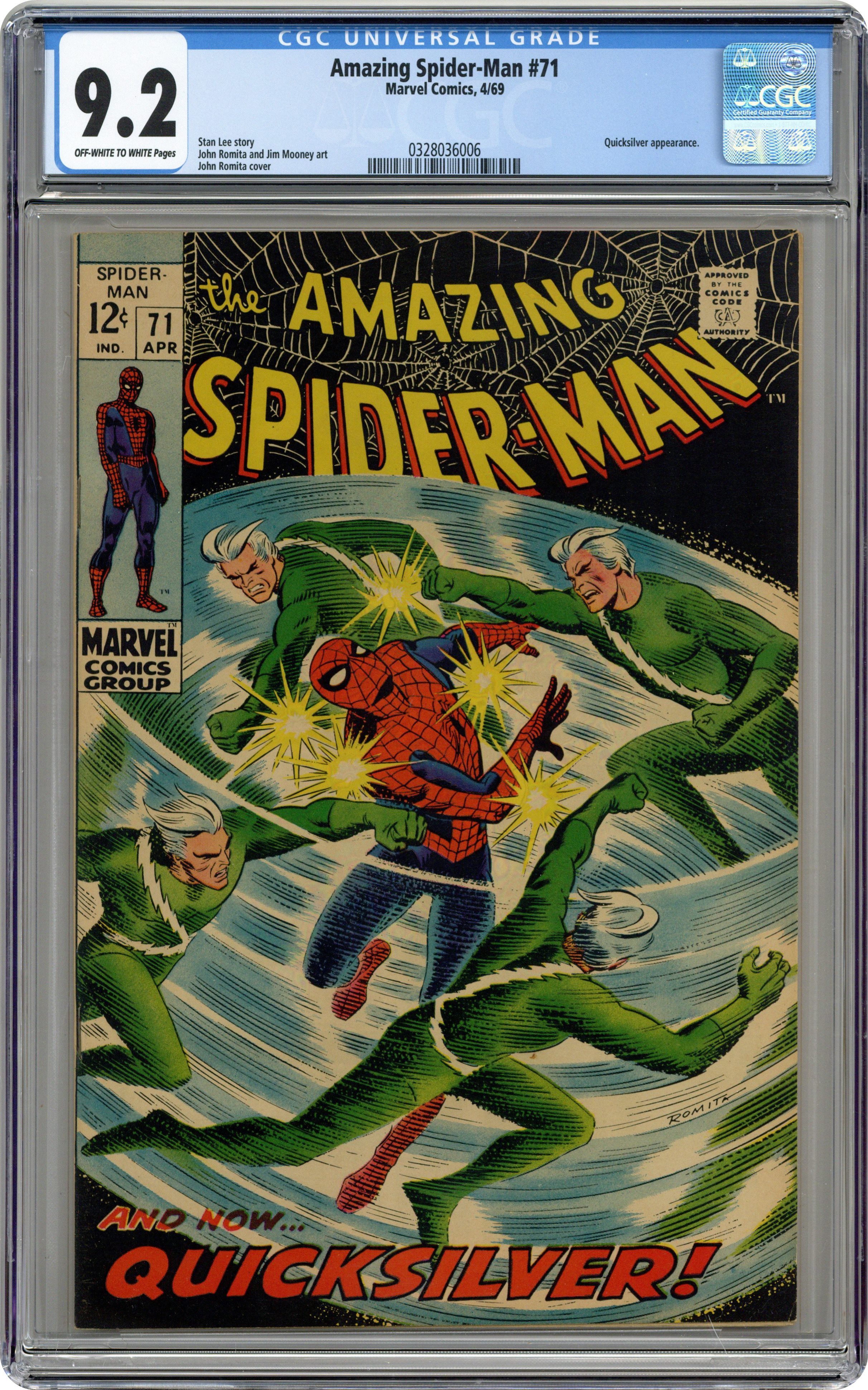Ended May 20 2020 Winning Bid $180 "The Speedster and the Spider!" Guest-starring Quicksilver. Plot by John Romita. Script by Stan Lee. Art by John Romita (layouts) and Jim Mooney (finishes). Cover by John Romita. A downtrodden web-slinger returns to his apartment after losing his temper with J. Jonah Jameson last issue. However Peter Parker's fortunes change the next day when he sells several photographs to the Daily Bugle's stand-in chief (Joe Robertson); and gives the troublesome clay tablet to Captain Stacy. Meanwhile, Quicksilver is back in New York and looking for a way to redeem himself. The mutantspeedster decides that bringing Spider-Man to justice would be the best way. So Pietro launches a surprise attack against the wall-crawler! Quicksilver vs. Spider-Man! May the fastest man win! First appearance of MarthaRobertson. Cameo appearances by Jarvis, Harry Osborn, John Jameson, Betty Brant, Ned Leeds, and Randy Robertson. Flashback cameos by the Scarlet Witch and the Toad. (Notes: Quicksilver and the Scarlet Witch previously appeared in Avengers (1st series) #53. This issue includes a statement of ownership: average print run 556,000; average paid circulation 373,303.) 36 pages. Cover price $0.12. Grade: CGC 9.2 explanation of grade Condition: Used (collectible)