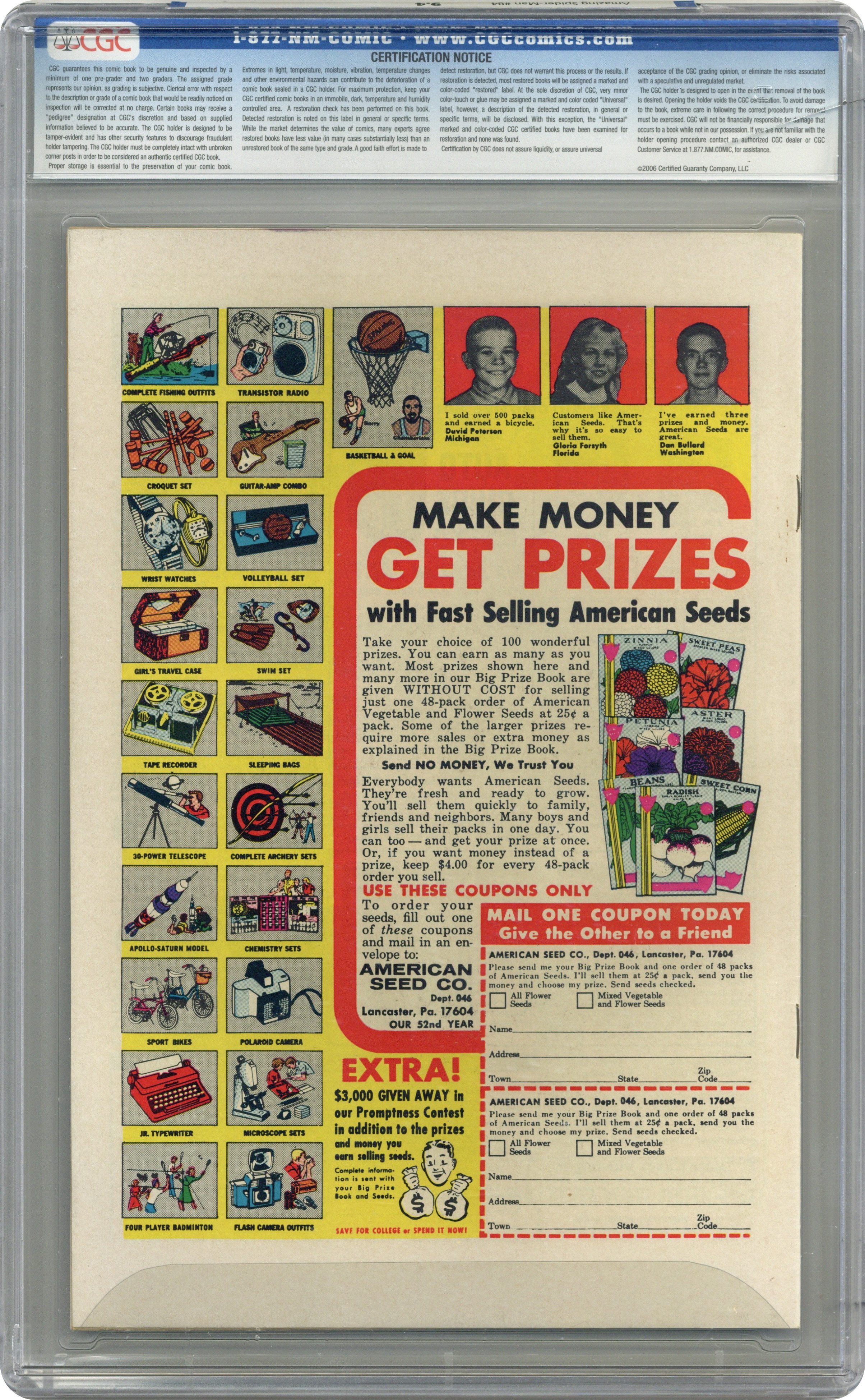 Ended May 19 2020 Winning Bid $215 "The Kingpin Strikes Back!" Part 2 of 3. Script by Stan Lee. Art by John Romita (layouts), John Buscema (pencils), and Jim Mooney (inks). Cover by John Romita. The Kingpin has grown tired of sitting on the sidelines. So he prepares to strike back against the Schemer! But the Schemer beats the big crime boss to the punch and invades Wilson Fisk's palatial manor! Once inside he confronts the Kingpin...and then he sees Vanessa Fisk -- the Kingpin's wife! The tension in the room could be cut with a knife...until the web-slinger crashes thru the window! And as shown on the brilliant cover, the wall-crawler and the Kingpin wage war in the mansion...while the Schemer deftly slips away. Both Spider-Man and the Kingpin will be left empty-handed on this night. Cameo appearances by Captain Stacy and Gwen Stacy. (Note: This story was reprinted in Marvel Tales #65.) 36 pages. Cover price $0.15. Grade: CGC 9.4 explanation of grade Condition: Used (collectible)