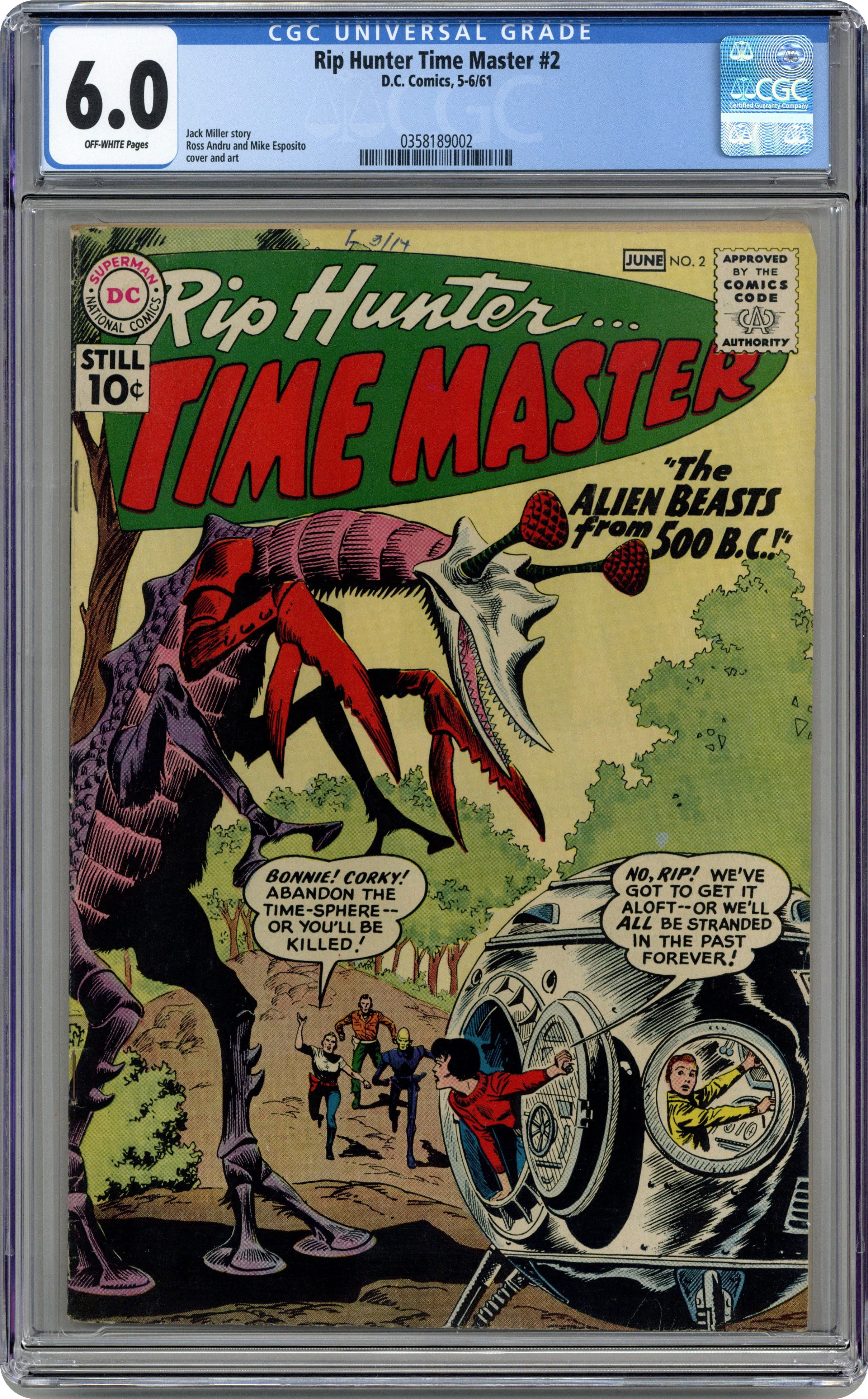 Ended May 13 2020 Winning Bid $73 Written by Jack Miller. Art and Cover by Ross Andru and Mike Esposito. Bonnie Baxter and Corky Baxter must abandon the Time Sphere...or they'll be killed! But no...they've got to get it aloft...or they'll all be stranded in the past forever! Don't miss Rip Hunter in the 3-part tale by Jack Miller, Ross Andru and Mike Esposito: "The Alien Beasts from 500 B.C."; "Chapter 2: The Battle of the Alien Beasts"; and "Chapter 3: Rip Hunter's Last Stand"! Plus: 1-page text story "The Anti-Time Island"! 32 pages, full color. Cover price $0.10. Grade: CGC 6.0 explanation of grade Condition: Used (collectible)