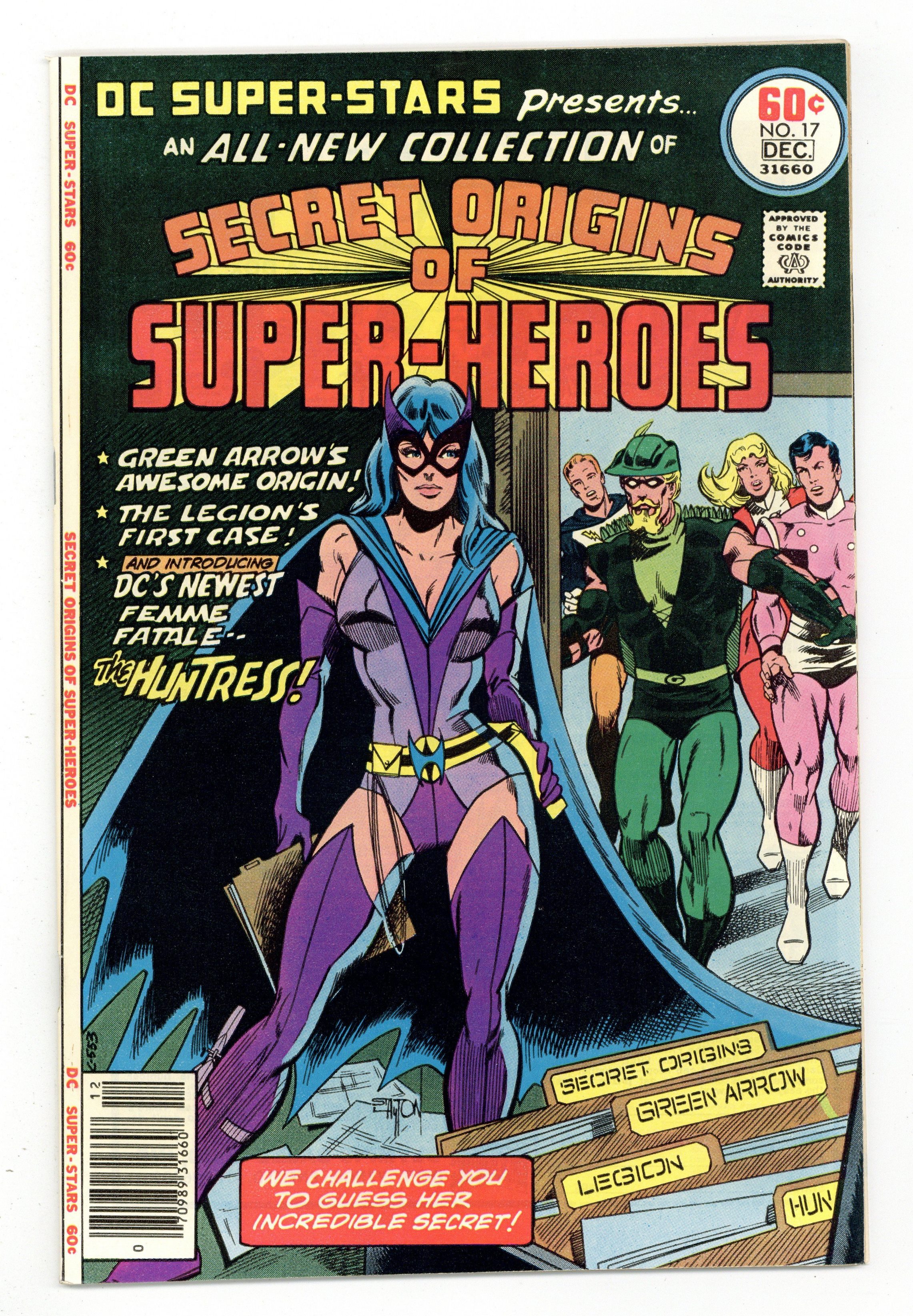 Ended May 9 2020 Winning Bid $205 Secret Origins of Super-Heroes -- an all-new collection! Green Arrow's awesome origin! The Legion's first case! And introducing DC's newest femme fatale -- the Huntress! Featuring: 1 page Legion of Super-Heroes; Huntress; Green Arrow story "Secret Origins of Super-Heroes" written by Paul Levitz and drawn by Jim Aparo; 10 page Green Arrow story "Origin of Green Arrow" written by Denny O'Neil and drawn by Mike Grell & Bruce Patterson; 10 page Legion of Super-Heroes story "The Secret of the Quintile Crystal!" starring the Legion of Super-Heroes [Cosmic Boy; Saturn Girl; Lightning Lad] (origin retold), Superman (cameo), R.J. Brande and Lord Lorval (villain), written by Jack C. Harris and drawn by Juan Ortiz & Bob Smith; 1 page text article "Secret Origins of Secret Origins" by Paul Levitz; 1 page Huntress illustration "Huntress Concept Art" drawn by Joe Staton (concept sketch) and Joe Orlando (cover design); 13 page Huntress story "From Each Ending...A Beginning!" starring Huntress [Helena Wayne] (origin), Batman (Earth-2), Catwoman (Earth-2), Flash [Barry Allen] (flashback), Flash [Jay Garrick] (flashback), Robin (Earth-2, flashback), Silky Cernak (villain) and Commissioner Gordon (Earth-2, cameo), written by Paul Levitz and drawn by Joe Staton & Bob Layton. Cover by Joe Staton & Bob Layton. Note : First appearance of second Huntress (Helena Wayne). This is shared by All Star Comics (1940-1978) #69 as they came out on the same day. Cover price $0.60. Grade: VF+ 8.5 explanation of grade Condition: Used (collectible)