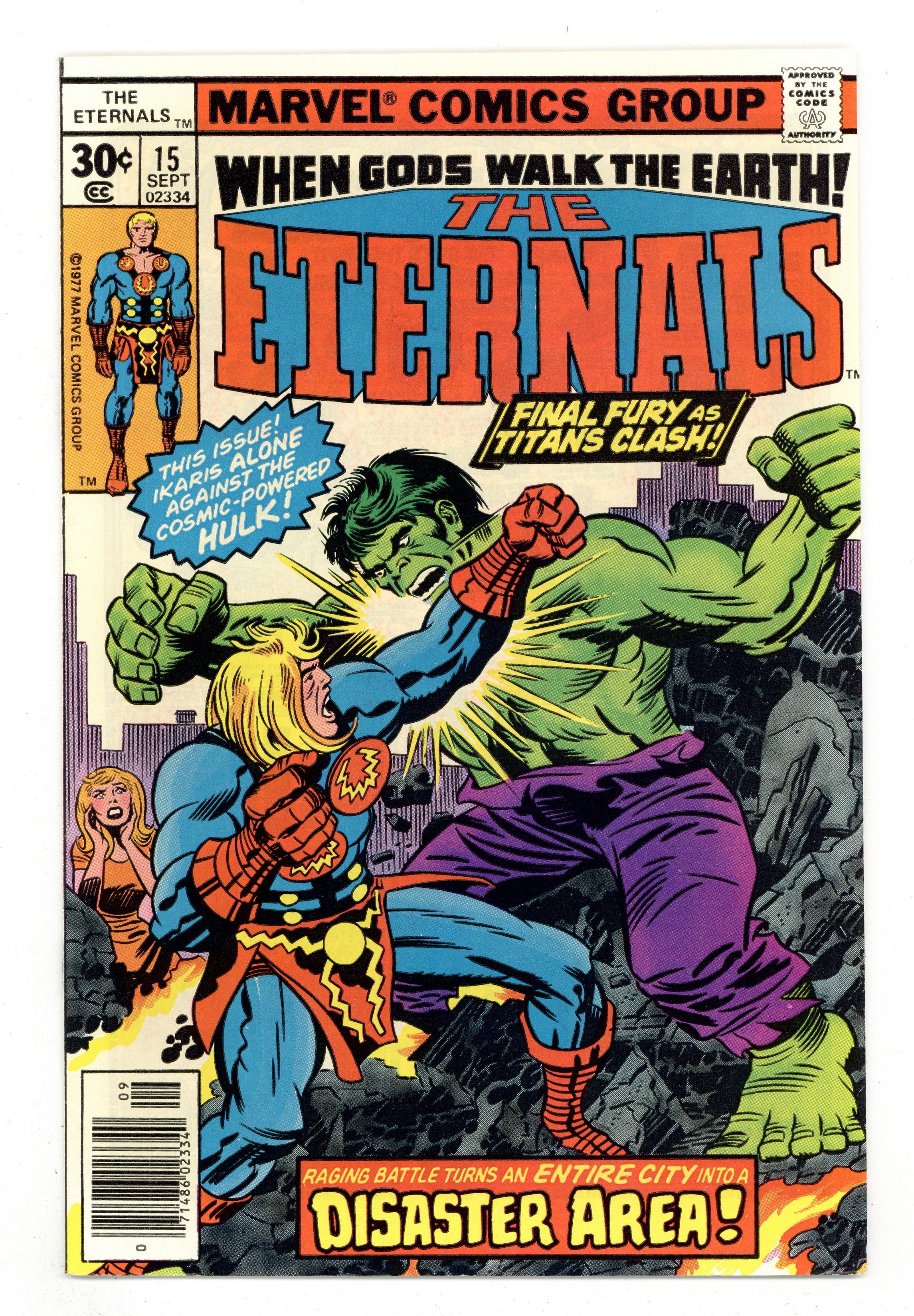 Ended May 19 2020 Winning Bid $17 "Disaster Area." Written by Jack Kirby. Pencils by Jack Kirby. Inks by Mike Royer. The battle between Ikaris and the cosmic-powered Hulk continues! But as these two immensely powerful warriors threatens to topple the city around them. Can even Ikaris contain the fury of the Cosmic Hulk?! Cover price $0.30. Grade: FN 6.0 explanation of grade Condition: Used (collectible)