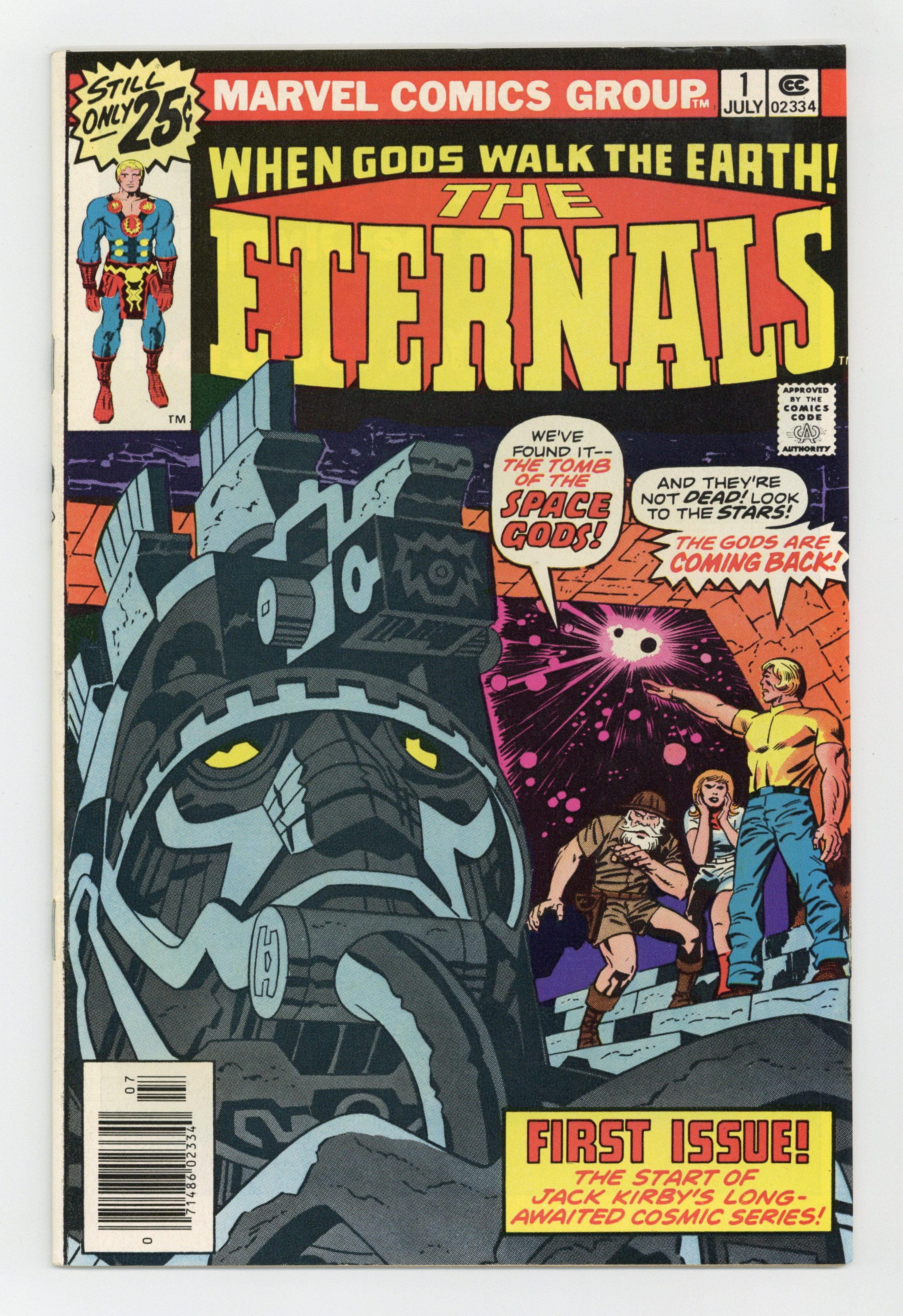 "The Day of the Gods." Written by Jack Kirby. Pencils by Jack Kirby. Inks by John Verpoorten. What if all the stories were true? All myths...all the legends... What if all the stories about gods and monsters were true? For archeologist Doctor Damian and his daughter Margo, those legends are about to become reality. The gods are real and they've lived among us for centuries. 1st appearance of Ikaris, Makkari, Kro and the Eternals as a team . 36 pages, full color. Cover price $0.25. Grade: FN/VF 7.0 explanation of grade Condition: Used (collectible)