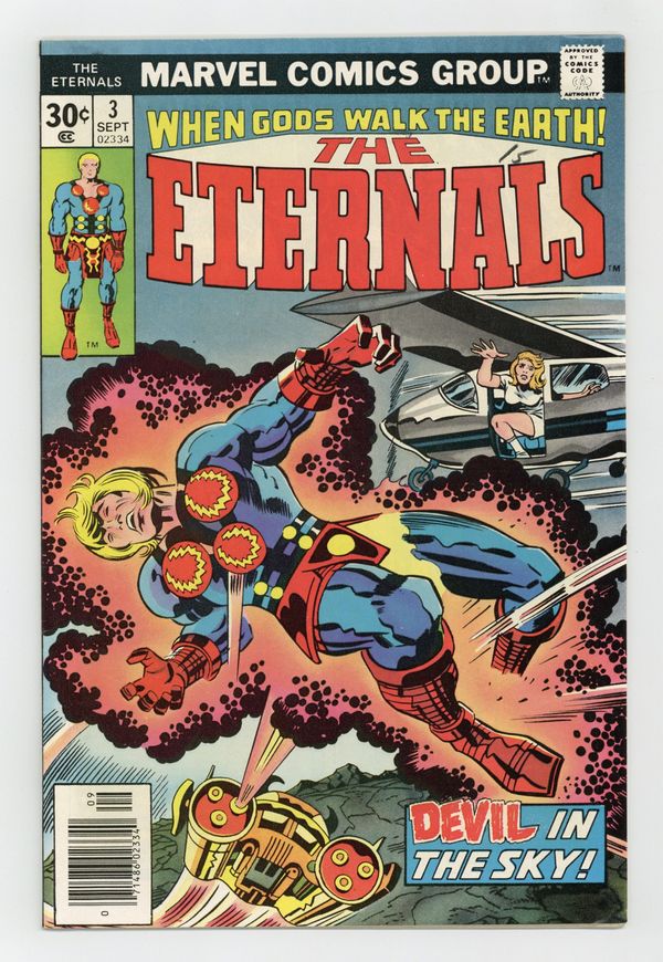 "The Devil in New York!" Written by Jack Kirby. Pencils by Jack Kirby. Inks by John Verpoorten. The hidden chapters in the history of man are quickly being revealed. The Celestials have returned! Untouched for thousand years, a large crypt in an Incan ruin has discharged a living flight crew. As Margo's head spins from all the fantastic sights she has seen, sights no mortal before has seen, Ikaris introduces her to the fabulous Eternal beauty known as Sersi. Meanwhile, if the gods haves returned, can the monsters be far behind. The beastly Deviants, the sworn enemy of the Eternals and mankind, prepare to attack! Notes: 1st appearance of Sersi. Letter to the editor from comics writer Ralph Macchio. Cover price $0.30. Grade: FN+ 6.5 explanation of grade Condition: Used (collectible)