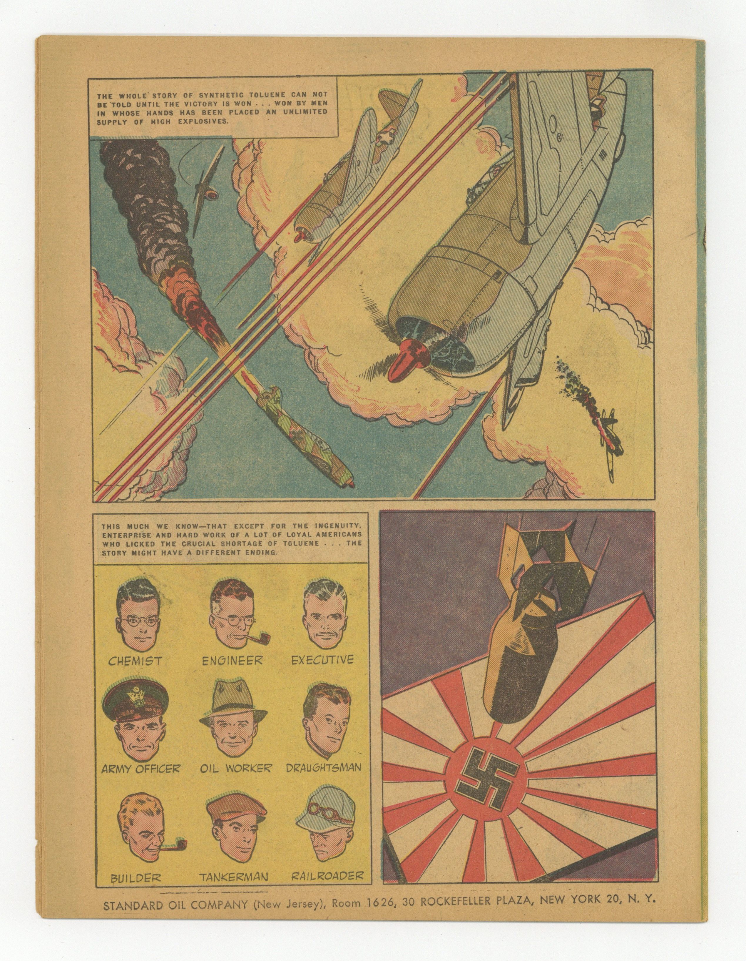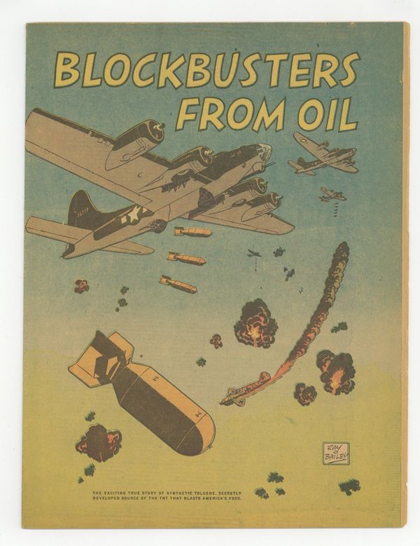 Ended May 6 2020 Winning Bid $73 Blockbusters from Oil (1942) is a promotional comic book, publisher unknown. Art by Ray Bailey (who also drew Tom Corbett, and Bruce Gentry). Blockbusters from Oil tells the story of T.N.T. and how it's becoming an integral part of our bombing raids against the Axis Powers. Great artwork highlights this comic, which includes battle scenes and even an appearance by Adolph Hitler. 16 pages, full color, standard comic book dimensions, all newsprint, no cover price. NOTE: All copies published have uneven page alignment on the right due to the binding process used; this is not considered a defect. Grade: FN+ 6.5 explanation of grade Condition: Used (collectible)