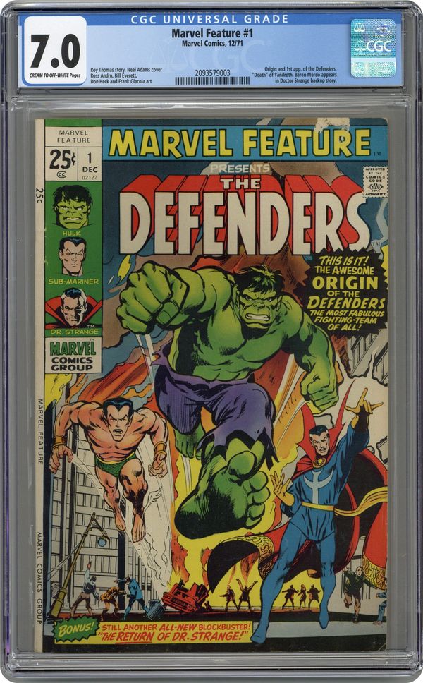 Ended May 6 2020 Winning Bid $154 Giant-size issue; 1st appearance and origin of the Defenders (featuring Sub-Mariner, Hulk, and Doctor Strange). Cover by Neal Adams. "The Day of the Defenders!," script by Roy Thomas, pencils by Ross Andru, inks by Bill Everett; The Defenders must stop Yandroth from destroying the Earth with the Omegatron. "The Sub-Mariner and the Icebergs" featuring Namora, Tha-Korr, and Byrrah, script and art by Bill Everett. "The Return!," script by Roy Thomas, pencils by Don Heck, inks by Frank Giacoia; Stephen Strange becomes Doctor Strange again to stop Baron Mordo. 52 pgs., full color. $0.25. Cover price $0.25. Grade: CGC 7.0 explanation of grade Condition: Used (collectible)