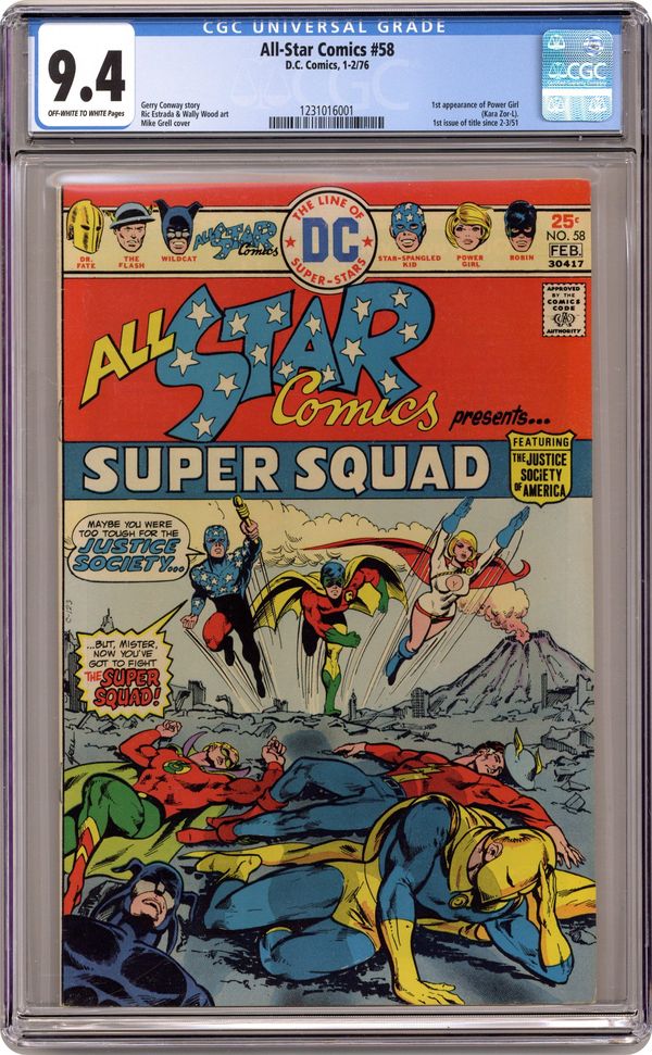 Ended May 20 2020 Winning Bid $223 1st appearance of Power Girl. Cover art by Mike Grell. The Super Squad! starring the All Star Super Squad, script by Gerry Conway, pencils by Ric Estrada, inks by Wally Wood; Power Girl describes the Super Squad as a strike force composed of the JSA and the three younger heroes--Robin, Power Girl, and Star-Spangled Kid. Letters from Roy Thomas and Jerry Bails. The Captive Commissioner Hostess ad starring Batman, pencils by Curt Swan, inks by Vince Colletta. 36 Pages, Full Color. Cover price $0.25. Grade: CGC 9.4 explanation of grade Condition: Used (collectible)