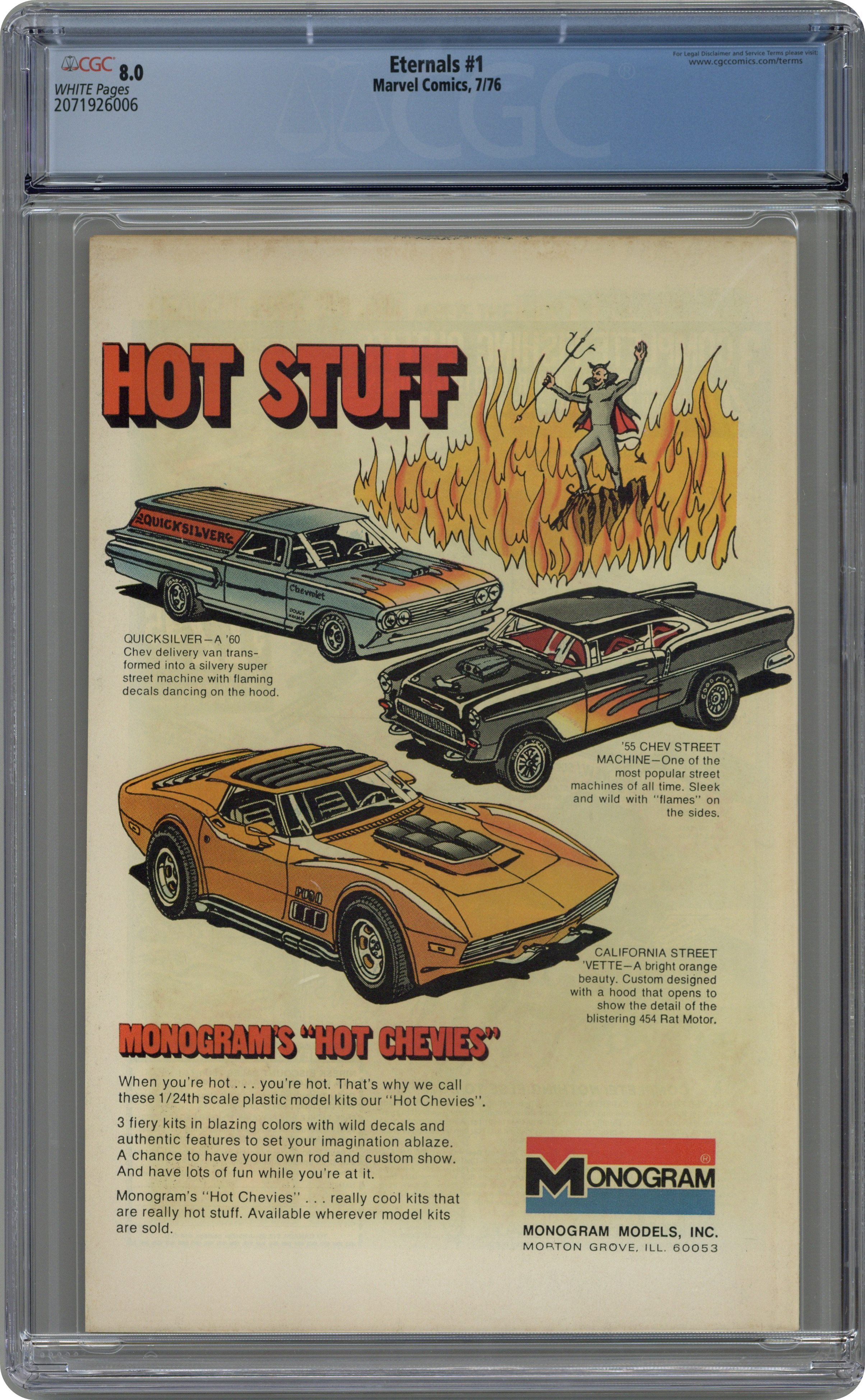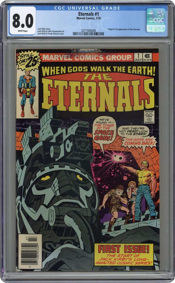 "The Day of the Gods." Written by Jack Kirby. Pencils by Jack Kirby. Inks by John Verpoorten. What if all the stories were true? All myths...all the legends... What if all the stories about gods and monsters were true? For archeologist Doctor Damian and his daughter Margo, those legends are about to become reality. The gods are real and they've lived among us for centuries. 1st appearance of Ikaris, Makkari, Kro and the Eternals as a team . 36 pages, full color. Cover price $0.25. Grade: CGC 8.0 explanation of grade Condition: Used (collectible)