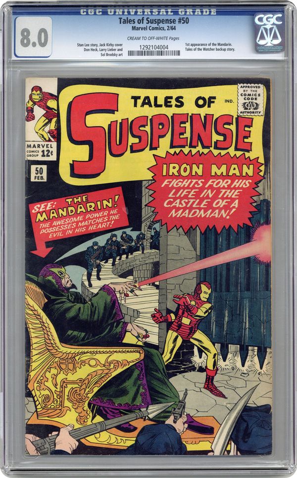 Ended May 6 2020 Winning Bid $731 Cover pencils by Jack Kirby, inks by George Roussos. The first appearance of the Mandarin is in the Iron Man story, "The Hands of the Mandarin!", script by Stan Lee, art by Don Heck; The Pentagon sends Iron Man into red China to get information on the Mandarin, an evil scientist feared even by the Communist regime; Iron Man struggles to overcome the Mandarin's powerful rings and martial arts, but he escapes his castle. "Them!", script by Stan Lee (plot) and Larry Lieber (script), pencils by Larry Lieber, inks by George Roussos (as G. Bell); A man frantically tries to convince passersby that he is being chased by storybook characters; He is arrested by the police, but disappears from his jail cell, as he himself is a fictional character created by Larry Lieber. "Journey's End!", script by Stan Lee (plot) and Larry Lieber (script), pencils by Larry Lieber, inks by Sol Brodsky; A meek and lonely space pilot volunteers for a suicide mission to investigate a strange cosmic cloud; the cloud hides a utopian planet, whose inhabitants only want humans brave enough to face the unknown to visit them. 36 pages, full color. Cover price $0.12. Grade: CGC 8.0 explanation of grade Condition: Used (collectible)