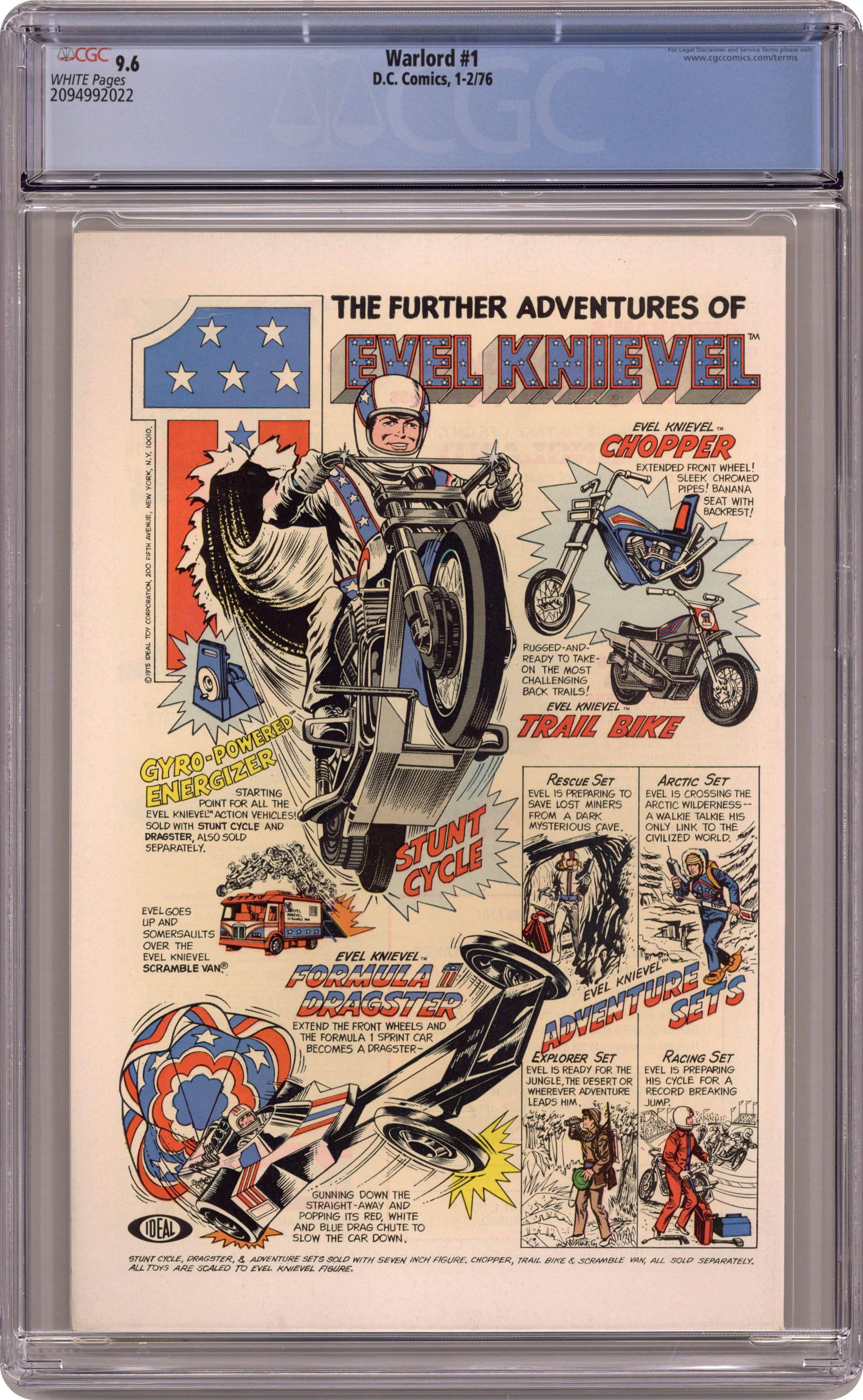 Ended May 6 2020 Winning Bid $58 Cover by Mike Grell. This Savage World, script and art by Mike Grell; Introduction of Travis Morgan into Skartaris is recapped; Tara, the first female lead, and Diemos are re-introduced. Continued from First Issue Special #8 (November 1975). Batman and the Captive Commissioner Hostess Fruit Pies ad, art by Curt Swan and Vince Colletta. Comics ad for the Evel Knievel toy from Ideal. 36 pgs., full color. $0.25. Cover price $0.25. Grade: CGC 9.6 explanation of grade Condition: Used (collectible)