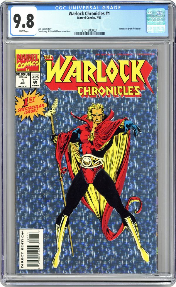 Ended May 8 2020 Winning Bid $27 Holografix and embossed cover, art by by Tom Raney and Keith Williams. Things Past, script by Jim Starlin, pencils by Tom Raney, inks by Keith Williams; Infinity Crusade crossover; Darklore reviews the history of Adam Warlock and tries to take his Infinity Gem. 36 pgs., full color. $2.95. Cover price $2.95. Grade: CGC 9.8 explanation of grade Condition: Used (collectible)