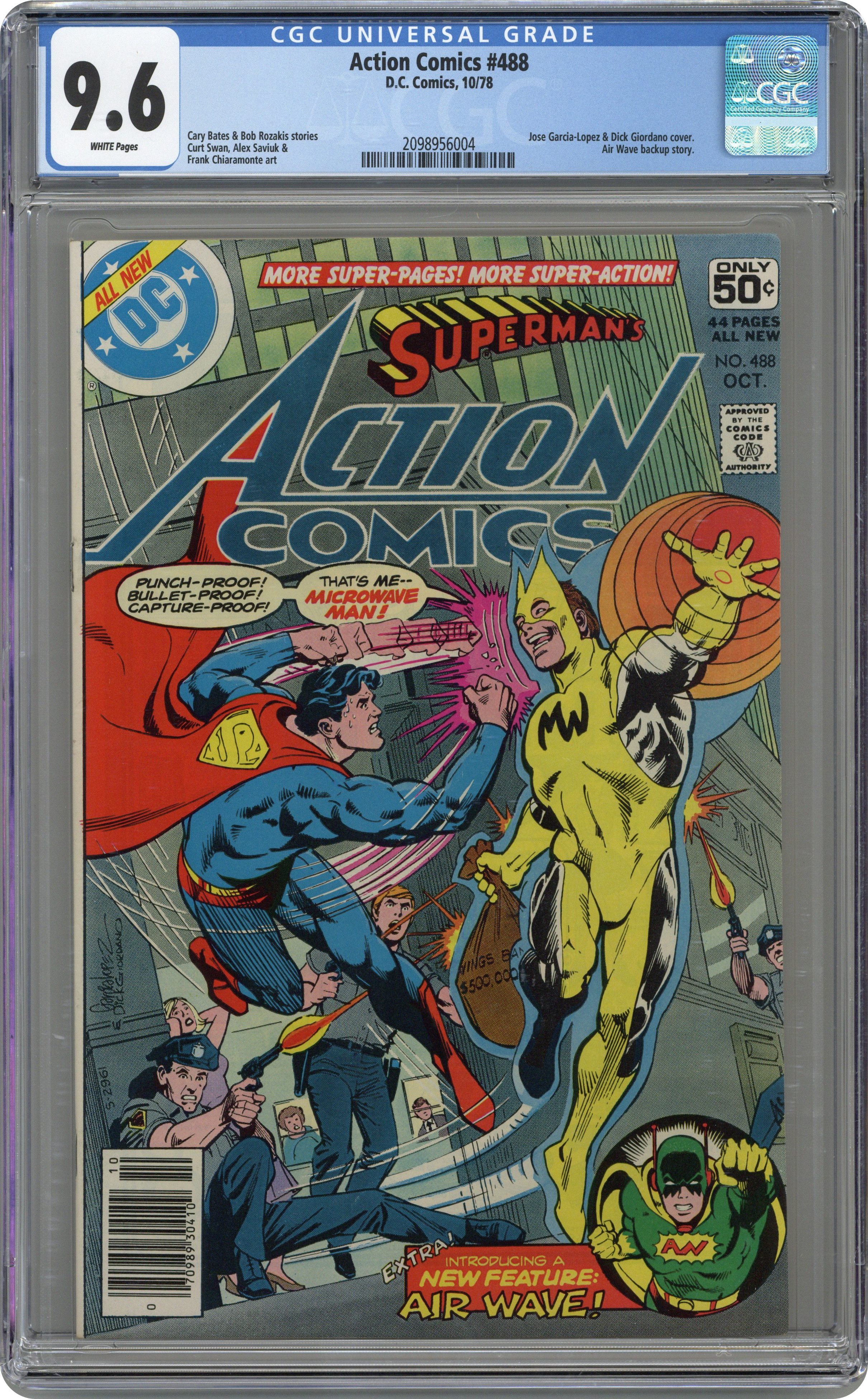 Ended Jul 14 2020 Winning Bid $34 44-page giant; Garcia Lopez cover. Superman in "Superman Battles Microwave Man!: written by Cary Bates with art by Curt Sewan and inks by Frank Chiaramonte. Air Wave begins as a back up feature in "A Close Shave for Air Wave!" with story by Bob Rozakis, art by Alex Savilik and inks by Frank Chiaramonte. Double page center spread ad for "The Infamous Milk Duds Superduds Sweepstakes!" featuring the Joker. Julius Schwartz, editor. 44 Pages, Full Color. Cover price $0.50. Grade: CGC 9.6 explanation of grade Condition: Used (collectible)