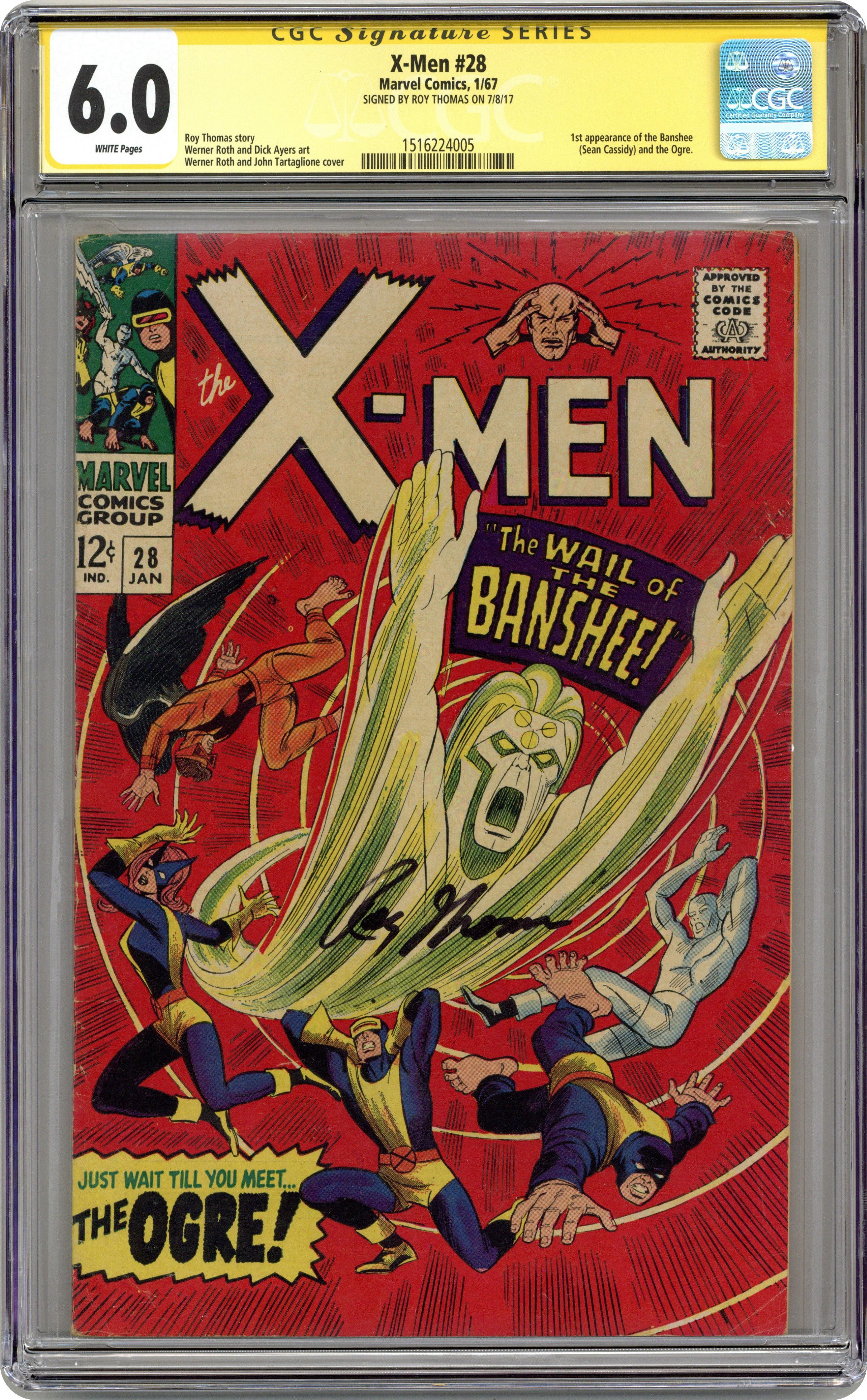 Ended May 5 2020 Winning Bid $145 1st printing. Cover pencils by Werner Roth, inks by John Tartaglione. The Wail of the Banshee!, script by Roy Thomas, pencils by Werner Roth, inks by Dick Ayers; Banshee is apparently a villain working with Ogre and the Factor Three; Banshee steals imported tobacco and a painting called the Gaelic Landscape; the X-Men test Mimics powers; 1st appearance of the Banshee. 36 pgs. $0.12. NOTE: 1994 JC Penney reprint exists. Can be identified by having a Stridex ad on the back cover. Cover price $0.12. Grade: CGC 6.0 explanation of grade Condition: Used (collectible)
