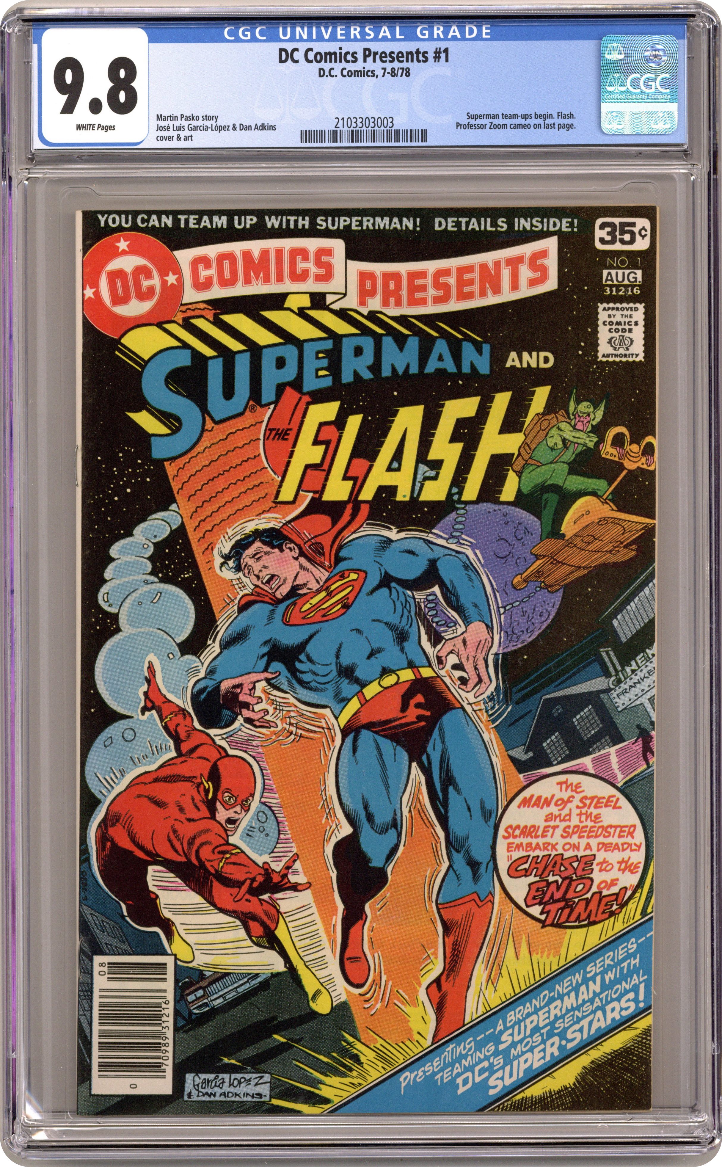 Ended May 24 2020 Winning Bid $69 Chase to the End of Time! - Written by Martin Pasko. Art and Cover by José Luis García-López and Dan Adkins. Presenting a brand-new series teaming Superman with DC's most sensational super-stars! The warring alien races the Volkir and the Zelkot come to Earth in pursuit of Zelkot Iylar who hopes to travel through time and prevent the aliens' war from ever beginning. The Zelkot threaten to destroy Earth if The Flash does not help Iylar complete his mission. But after The Flash heads off after Iylar, the Volkir convince Superman to stop Iylar or he will change history and Krypton will explode eons earlier than it did. Continues next issue. Characters in this issue: Superman [Clark Kent; Kal-El]; The Flash [Barry Allen]; Islayn (villain, a Volkir); Aylem (villain, a Zelkot); Iylar; Reverse-Flash [Professor Zoom; Eobard Thawne] (cameo). Plus: Aquaman and Aqualad in 1-page Hostess Twinkies ad "Imperiled Sub" with art by Curt Swan and Vince Colletta. 32 pages, full color. Cover price $0.35. Grade: CGC 9.8 explanation of grade Condition: Used (collectible)