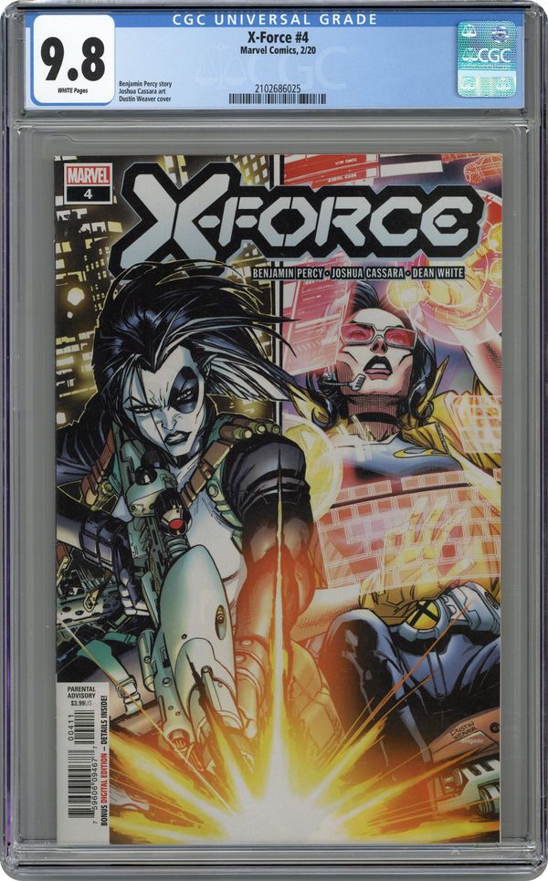 Ended May 7 2020 Winning Bid $24 Written by Ben Percy. Art by Joshua Cassara. Cover by Dustin Weaver. THE BEST DEFENSE… TARGET: ALL ENEMIES OF MUTANTKIND! First, the new team strikes back against the humans who took one of their own. Then, with its orders established, the new X-Force hits the ground running, taking on deadly threats targeting mutantkind's rightful place in the world… 28 pages, full color. Parental Advisory Cover price $3.99. Grade: CGC 9.8 explanation of grade Condition: Used (collectible)