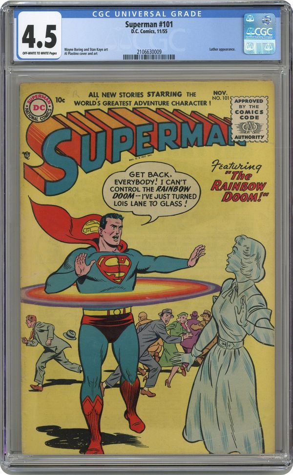 Ended May 7 2020 Winning Bid $155 Cover art by Al Plastino. Luthor's Amazing Rebus starring Superman and Lex Luthor, pencils by Wayne Boring, inks by Stan Kaye. The Meek Man's Club starring Superman, art by Al Plastino. The Rainbow Doom, art by Al Plastino; Superman accidentally turns Lois Lane into glass. 36 Pages, Full Color. Cover price $0.10. Grade: CGC 4.5 explanation of grade Condition: Used (collectible)