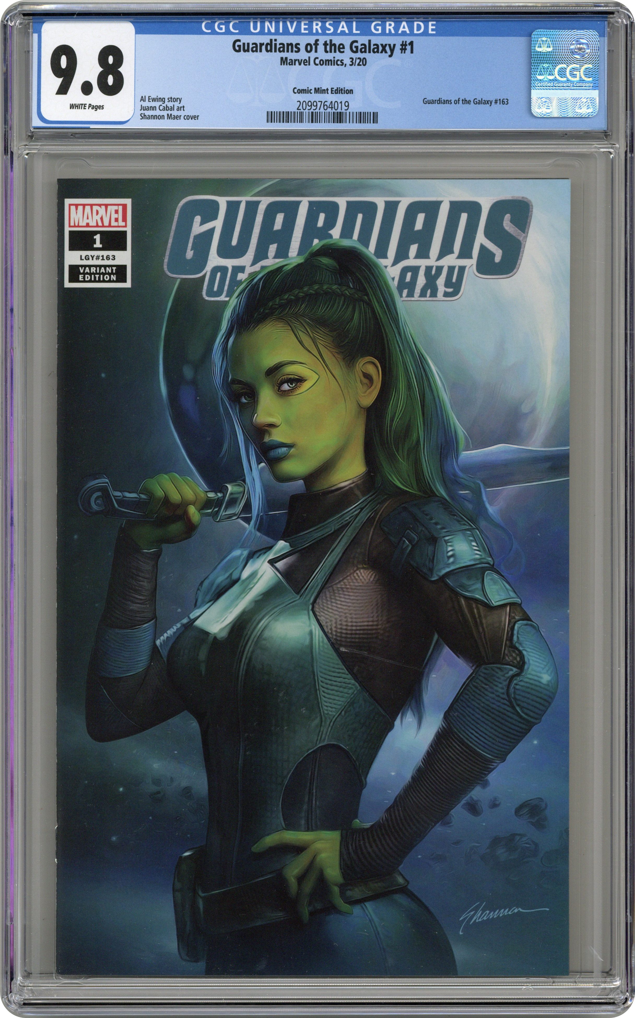 Ended May 14 2020 Winning Bid $65 The Comic Mint exclusive variant by Shannon Maer - Limited to 3000 copies. Written by Al Ewing. Art and Cover by Juan Cabal. Once, they were a team of misfits. Now they're a family, and they've earned their peace. But the universe is not a peaceful place -- and it's only getting worse. The Great Empires are in turmoil. The rule of law is dead. And amidst the chaos, the Gods of Olympus have returned -- harbingers of a new age of war, reborn to burn their mark on the stars themselves. Someone has to guard the galaxy - but who will accept the mission? And will they survive it? Al Ewing (IMMORTAL HULK) and Juann Cabal (FRIENDLY NEIGHBORHOOD SPIDER-MAN) bring you in on the ground floor of a whole Marvel Universe of action and suspense! 36 pages, full color. Rated T+ Grade: CGC 9.8 explanation of grade Condition: Used (collectible)