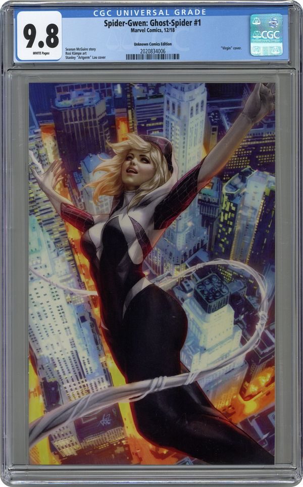 Ended May 7 2020 Winning Bid $62 Unknown Comics variant cover by Stanley "Artgerm" Lau. Written by Seanan McGuire. Art by Rosi Kampe. Cover by Bengal. A SPIDER-GEDDON TIE IN! What? You thought we were done with Gwen Stacy after the first two landmark volumes of her series?! GET OUTTA HERE. It's a whole new spin on Gwen and her world of Earth-65, brought to you by none other than SEANAN MCGUIRE & ROSI KÄMPE! We pick up with Gwen right where we left her - fighting crime through her home reality, unaware that it sits on the precipice of interdimensional calamity! Someone's gonna be late to band practice. 28 pages, full color. Rated T+ Grade: CGC 9.8 explanation of grade Condition: Used (collectible)
