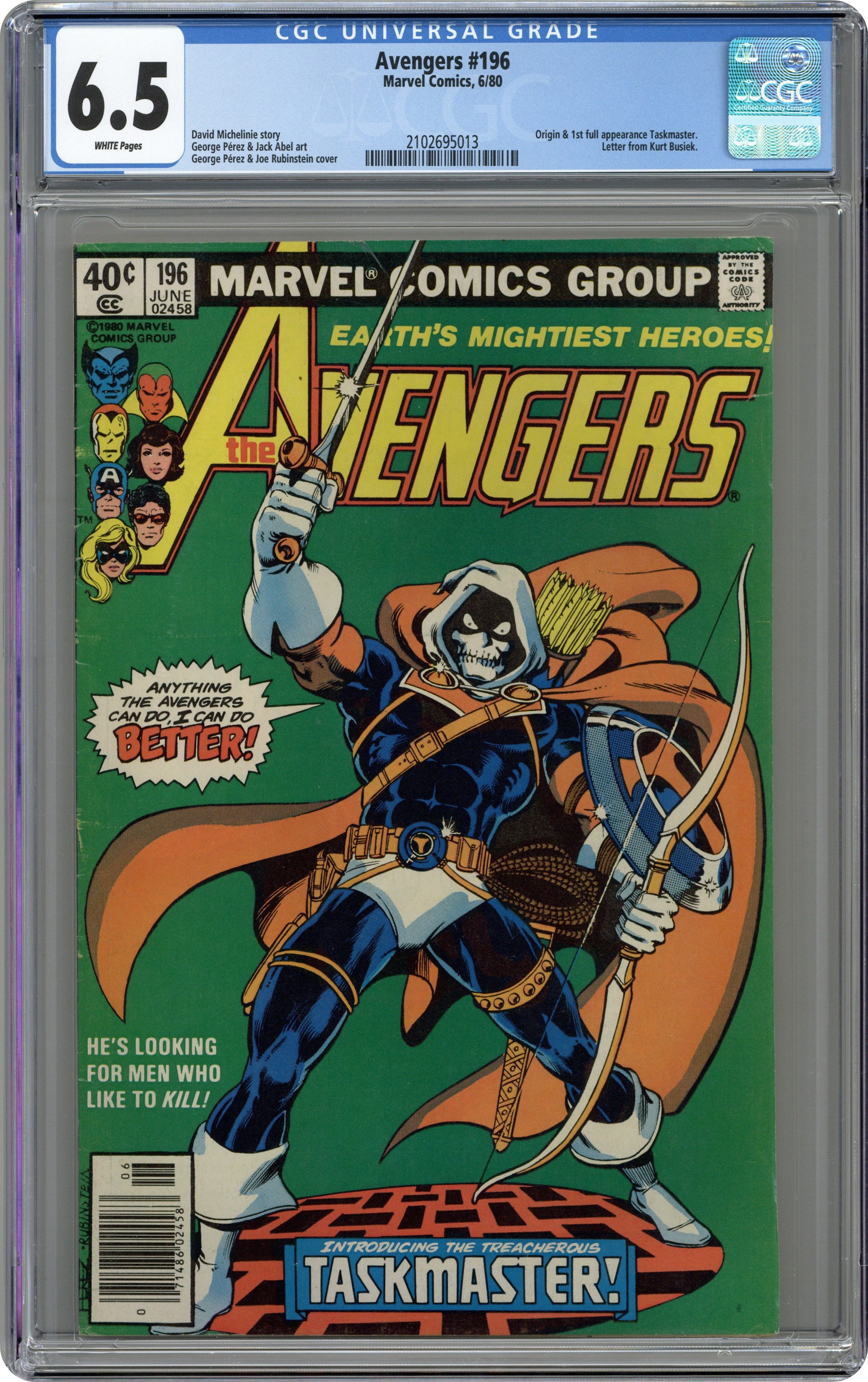 Ended May 11 2020 Winning Bid $116 Direct Edition. "The Terrible Toll of the Taskmaster" Guest-starring Ant-Man. Script by David Michelinie. Pencils by George Perez. Inks by Jack Abel. Cover by George Perez and Joe Rubinstein. A brand new villain, the Taskmaster, has turned the tables on the Wasp, Yellowjacket, and Ant-Man! The three insect-like super-heroes are prisoners inside the Taskmaster's training academy! The good news is that seven avengers are waiting outside the training compound, but the bad news...none of them know that their teammates are in grave danger! However, Earth Mightiest Heroes follow the ants, and the trail leads to the Taskmaster! Is the villain with the photographic reflexes ready to battle the Avengers? Choose wisely dear Taskmaster! First (full) appearance and origin of the Taskmaster. (Notes: The Taskmaster appears next in Marvel Team-Up 103. The letters page includes a letter from comics writer Kurt Busiek.) 36 pages Cover price $0.40. Grade: CGC 6.5 explanation of grade Condition: Used (collectible)