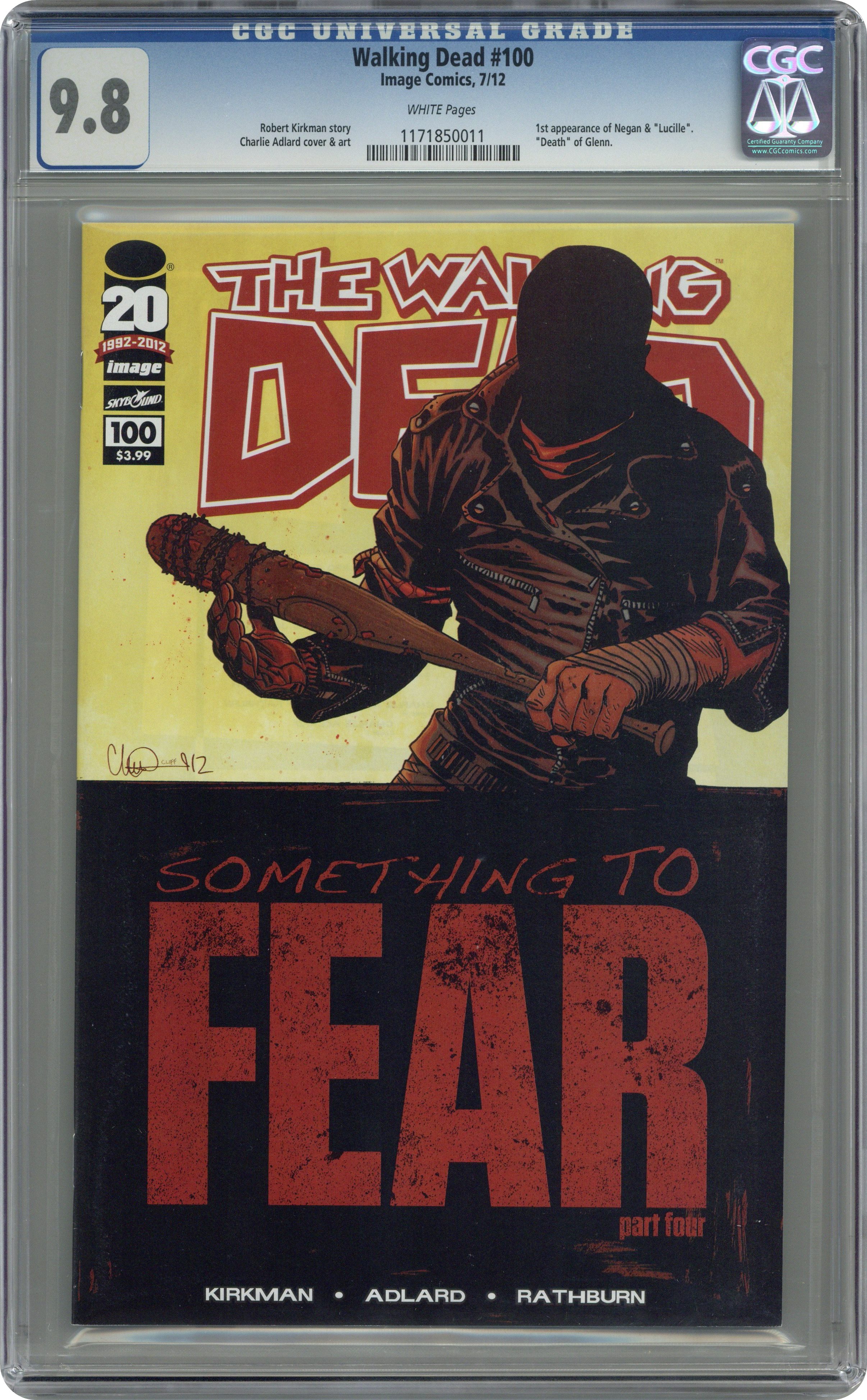 Ended May 6 2020 Winning Bid $81 Cover by Charlie Adlard. First appearance of Negan & "Lucille", Death of Glenn. Something to Fear: Part 4 of 6 - (W) Robert Kirkman (A) Charlie Adlard, Cliff Rathburn 'SOMETHING TO FEAR' CONTINUES! This extra-sized chapter contains one of the darkest moments in Rick Grimes' life, and one of the most violent and brutal things to happen within the pages of this series. 100 issues later, this series remains just as relentless as the debut issue. Do not miss the monumental 100th issue of THE WALKING DEAD! NOTE: 1st Appearance of of Negan & Lucille. Cover price $3.99. Grade: CGC 9.8 explanation of grade Condition: Used (collectible)