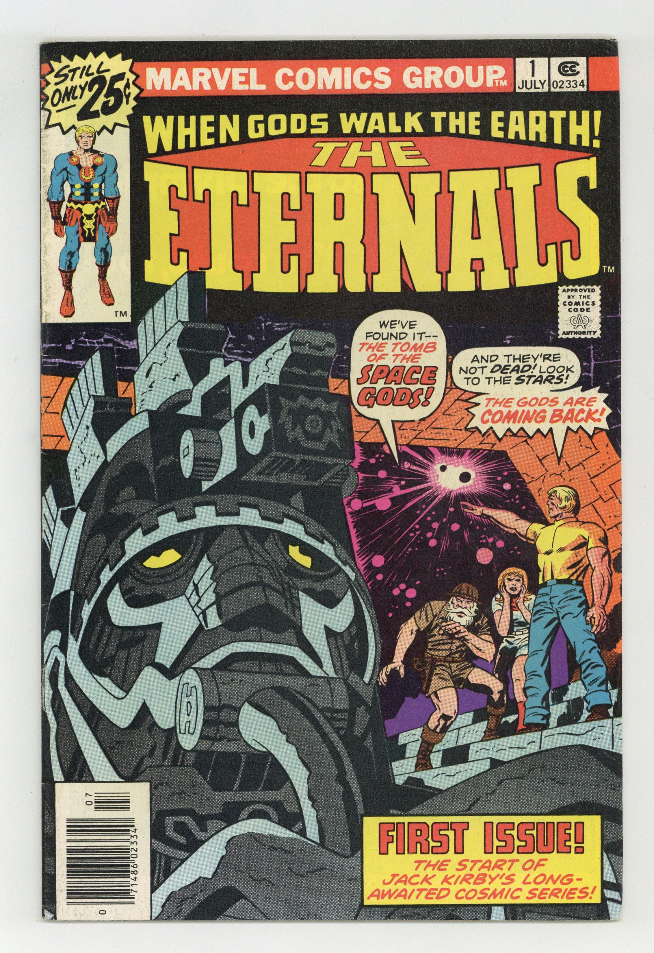 "The Day of the Gods." Written by Jack Kirby. Pencils by Jack Kirby. Inks by John Verpoorten. What if all the stories were true? All myths...all the legends... What if all the stories about gods and monsters were true? For archeologist Doctor Damian and his daughter Margo, those legends are about to become reality. The gods are real and they've lived among us for centuries. 1st appearance of Ikaris, Makkari, Kro and the Eternals as a team . 36 pages, full color. Cover price $0.25. Grade: FN 6.0 explanation of grade Condition: Used (collectible)