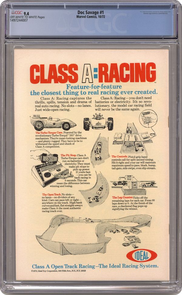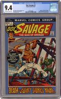 Comic book version of the classic pulp magazine hero Doc Savage. Issue features "The Man of Bronze," part one of an adaptation of the Kenneth Robeson novel of the same name in which Doc and his team try to track down who killed his father. Issue also has a one-page text feature on Doc Savage's team members. Script by Roy Thomas and Steve Englehart and art by Ross Andru and Jim Mooney. Cover price $0.20. Grade: CGC 9.4 explanation of grade Condition: Used (collectible)