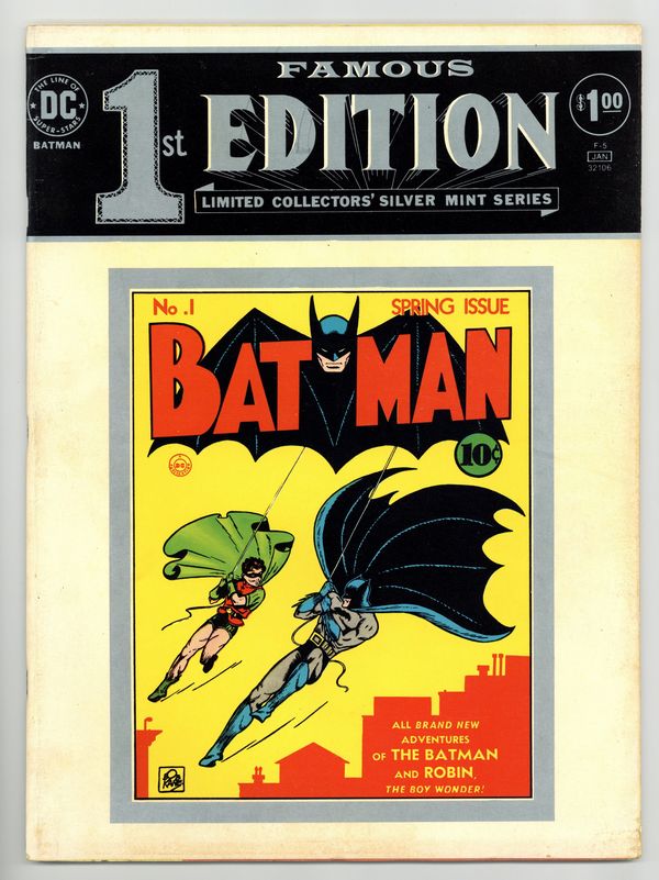 Softcover Edition. Famous First Edition Limited Collectors' Silver Mint Series #F5 (but says F6 on inside): Batman #1. Reprints Batman #1 from cover to cover including the original ads NOTE: This almost exact replica edition is 10 x 13-1/2" (about the size of a Life magazine); it contains two covers. The original, 1940 first edition is standard comic book size. Softcover Edition. Cover price $1.00. Grade: FN- 5.5 explanation of grade Condition: Used (collectible)