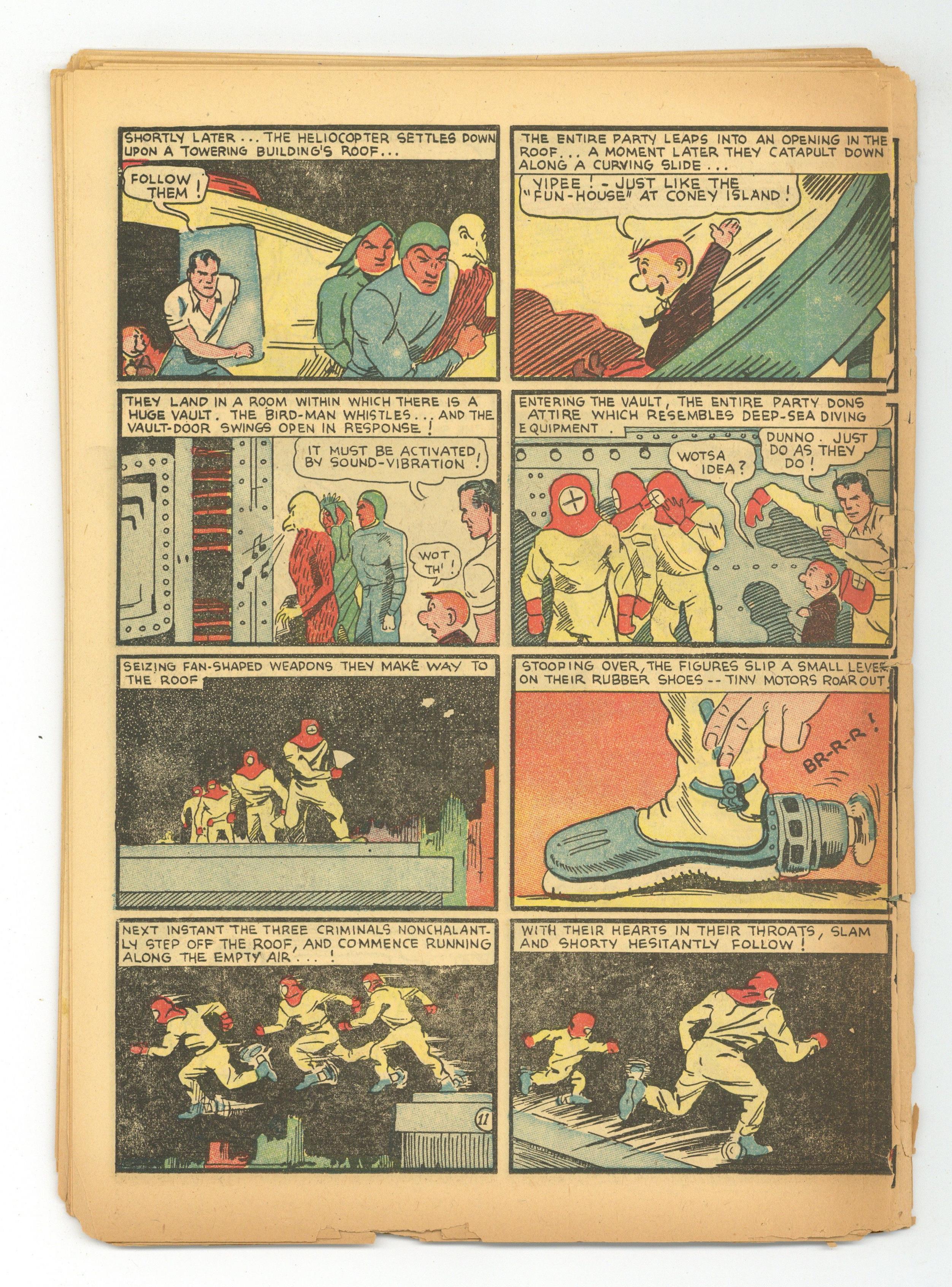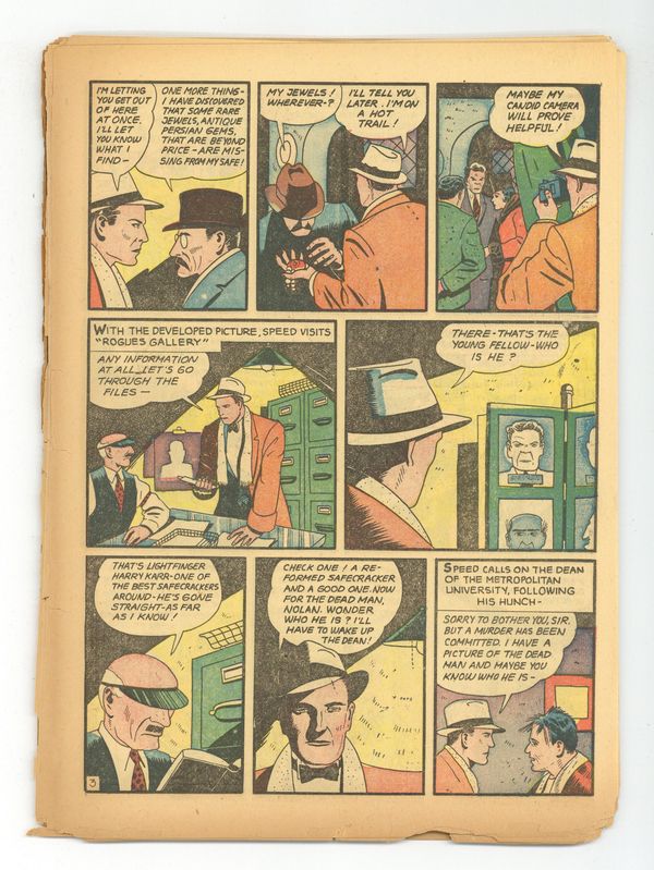 Ended Jan 14 2021 Winning Bid $65 Cover art by Fred Guardineer. Cleo and Clancy humor page by Bob Kane. The Persian Jewel Mystery starring Speed Saunders, script by Gardner Fox, art by Fred Guardineer. Oscar the Gumshoe humor page by Bob Kane. Larry Steele story, script and art by Will Ely. Cosmo story, art by Sven Elven. Spy story, script by Jerry Siegel, art by the Shuster Shop. Dr. Fu Manchu story, script by Sax Rohmer, art by Leo O'Mealia. The Old Grey House text story by Terry Keane. Crimson Avenger story, art by Jim Chambers. Back From the Dead (Part 1) starring Bruce Nelson, art by Tom Hickey. Paper Trail starring Buck Marshall, script and art by Homer Fleming. Slam Bradley story, script by Jerry Siegel, art by the Shuster Shop. 68 pgs. $0.10. Cover price $0.10. Grade: Coverless explanation of grade Condition: Used (collectible)