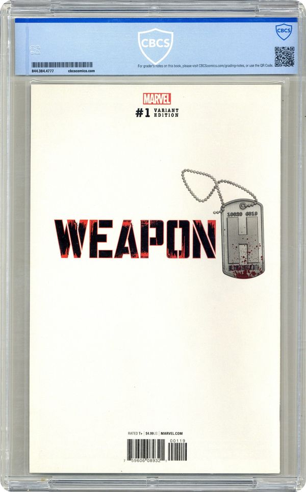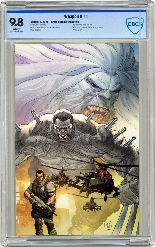 Limited 1 for 100 Retailer Incentive Variant Cover. Written by Greg Pak. Art by Cory Smith. Cover by Leinil Francis Yu. AWOL Part 1 The Weapon X Program has done it again! At the cost of their own destruction, they've completed their biggest and possibly most dangerous experiment yet… With the strength of the Hulk and the rage and claws of Wolverine comes WEAPON H! It's been some time since Weapon H escaped and destroyed his creators. Now, our hero is on the run, as he tries to escape his mysterious past and seclude himself from the rest of society. But when a new kind of Wendigo threatens the lives of others, will Weapon H be able to shirk his responsibility? Does any of his humanity remain? Only the creative team of Greg Pak (INCREDIBLE HULK) and Cory Smith (X-MEN BLUE) can give you the answers! 36 pages, full color. Rated T+ Cover price $4.99. Grade: CBCS 9.8 explanation of grade Condition: Used (collectible)