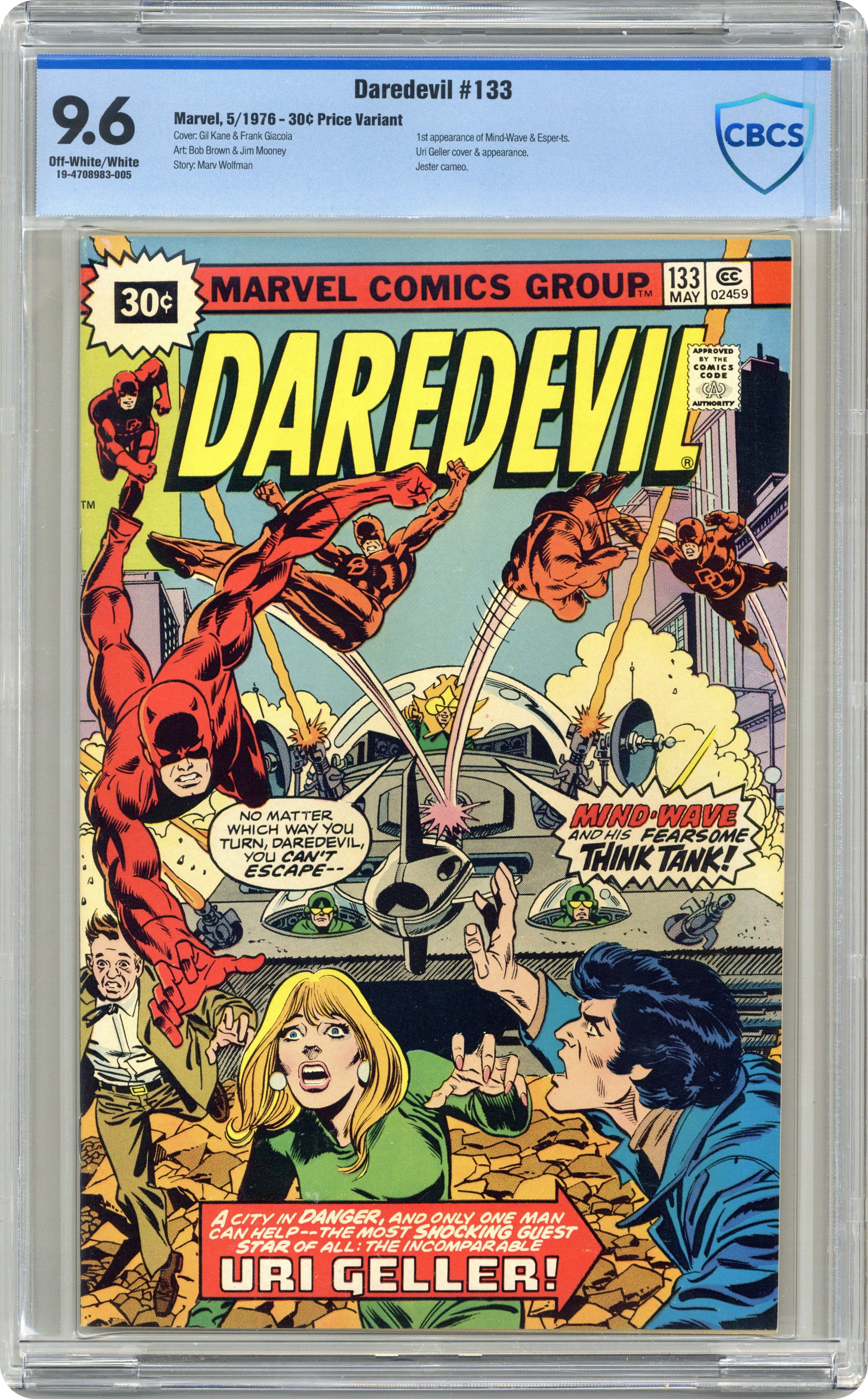 Ended Jul 17 2023 Winning Bid $165 "Mind-Wave and His Fearsome Think Tank" Written by Marv Wolfman. Pencils by Bob Brown. Inks by Jim Mooney. Cover pencils by Gil Kane with inks by Frank Giacoia. Starring Uri Geller. DD and a real life psychic take on the nefarious schemes of Mind-Wave. Letters page has a profile and photo of Uri Geller as well as a psychic drawing he did with Marv Wolfman. This controversial issue is discussed at length in the letters page to Daredevil #137. Notes: First appearance of Mind-Wave. This is the 30-cent cover price edition, which had limited distribution (for market testing). There also exists a 25-cent cover price edition which is much more common. Cover price $0.30. Grade: CBCS 9.6 explanation of grade Condition: Used (collectible)