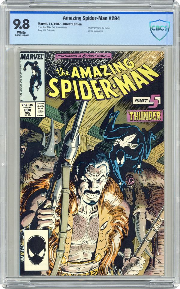 Ended Oct 16 2020 Winning Bid $145 Direct Edition. Kraven's Last Hunt: Part 5 of 6 -- "Thunder" Script by J.M. DeMatteis. Pencils by Mike Zeck. Inks by Bob McLeod. Cover by Mike Zeck and Bob McLeod. Story continues from Web of Spider-Man 32. A furious web-slinger confronts Kraven inside his lair! However, the depraved hunter doesn't want to fight! He only wants to talk and show the wall-crawler his prized possession downstairs: Vermin! Spider-Man is confused. The man-rat is scared. And Kraven has gone off the deep end! When the disturbed hunter lets Vermin go, the amazing one has no choice but to battle the tormented creature and pursue him into the streets! Once Kraven is alone, he completes his final hunt in horrendous fashion. Story concludes in Spectacular Spider-Man 132. Death of Kraven the Hunter. (Notes: In 1992 a sequel to this six-part saga was published: The Amazing Spider-Man Soul of the Hunter. An alternative reality in which Kraven actually killed Spider-Man is explored in What If (2nd series) 17. At the time of its publication, this issue generated considerable controversy due to Kraven's violent death by his own hands.) 36 pgs. Cover price $0.75. Grade: CBCS 9.8 explanation of grade Condition: Used (collectible)