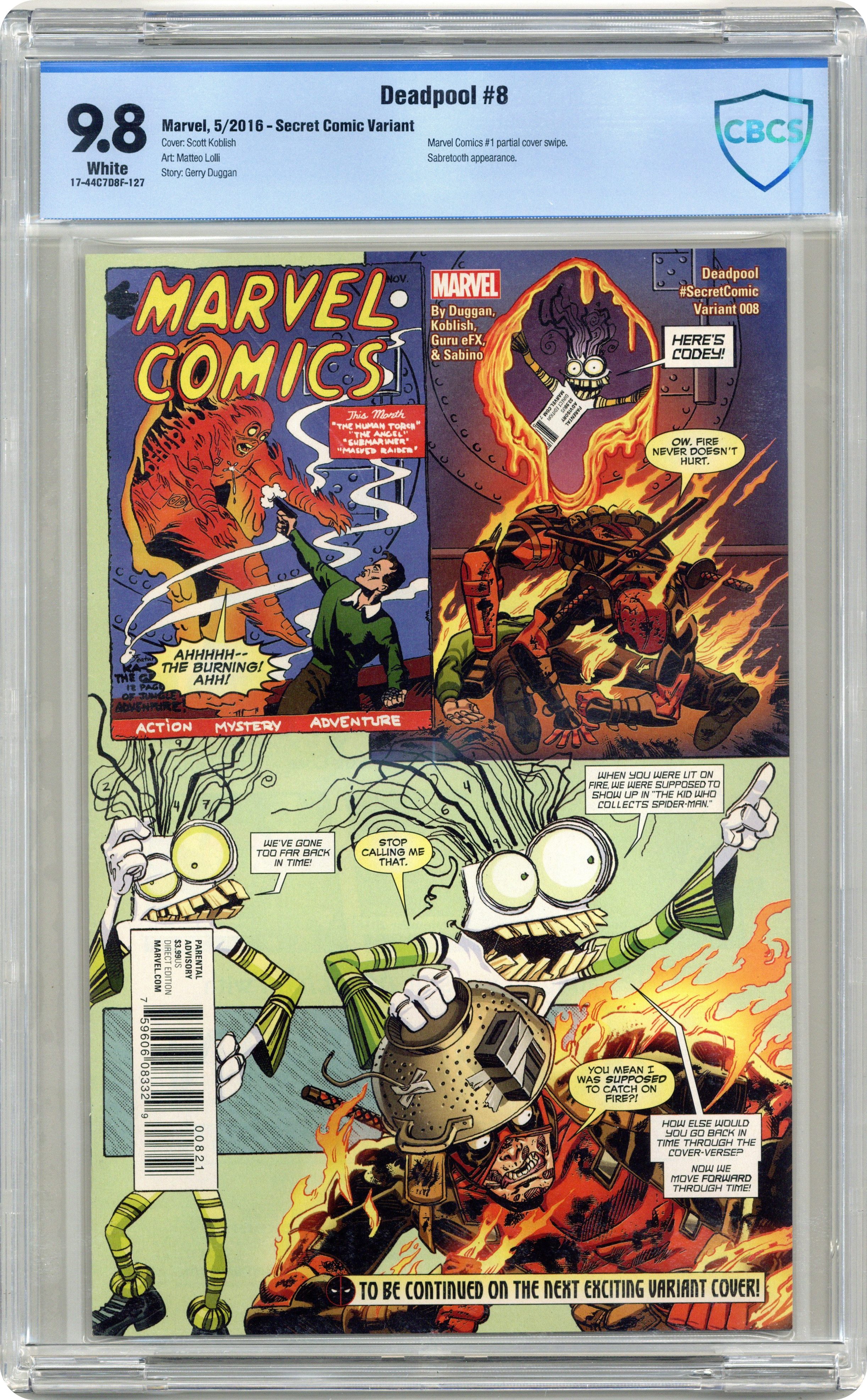 Ended Oct 26 2020 Winning Bid $22 Written by Gerry Duggan. Art by Matteo Lolli. Cover by Scott Koblish. DEADPOOL VS. SABRETOOTH STARTS NOW! Deadpool has no idea that he killed his own parents. SHHH! Don't tell! Only problem is...he's investigating whodunit, swearing vengeance. Don't worry! He thinks SABRETOOTH did it! This is gonna be a fun fight. 28 pages, full color. Parental Advisory Cover price $3.99. Grade: CBCS 9.8 explanation of grade Condition: Used (collectible)