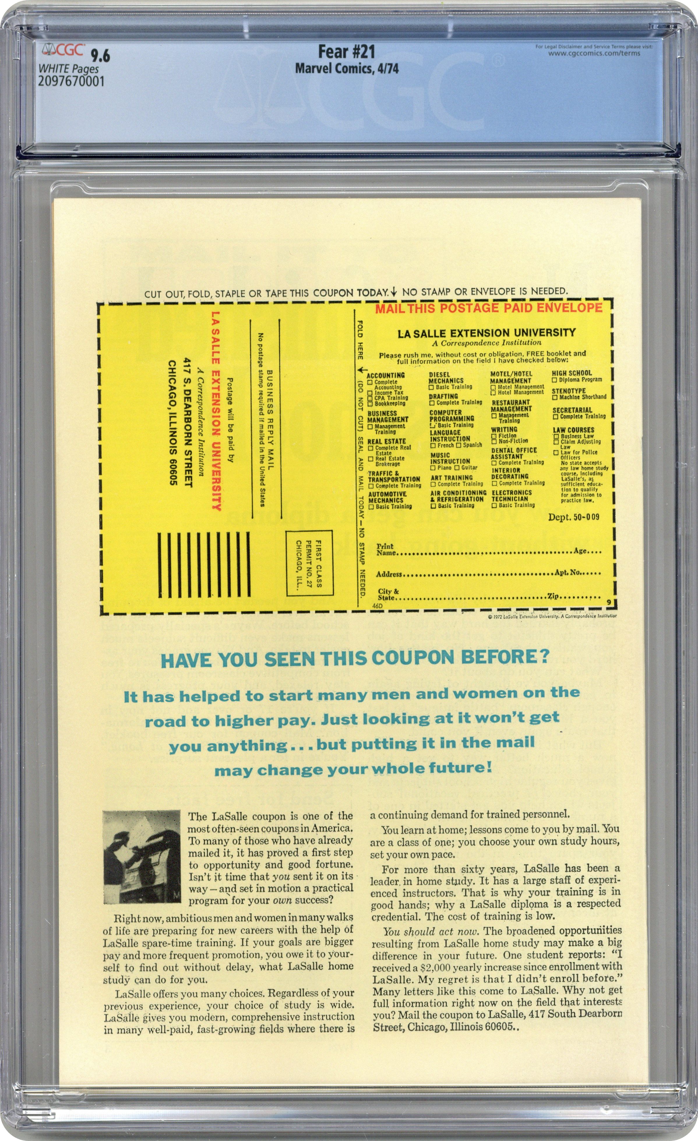 Last 20-cent cover price. Morbius stars in "Project: Second Genesis!" Script by Steve Gerber, pencils by Gil Kane, inks by Vince Colletta. Reprint back-up story: "Sorry, Mr. Hopkins!" The letters page contains Marvel Value Stamp series A # 77 (the Swordsman by Gene Colan). Gil Kane cover. Cover price $0.20. Grade: CGC 9.6 explanation of grade Condition: Used (collectible)