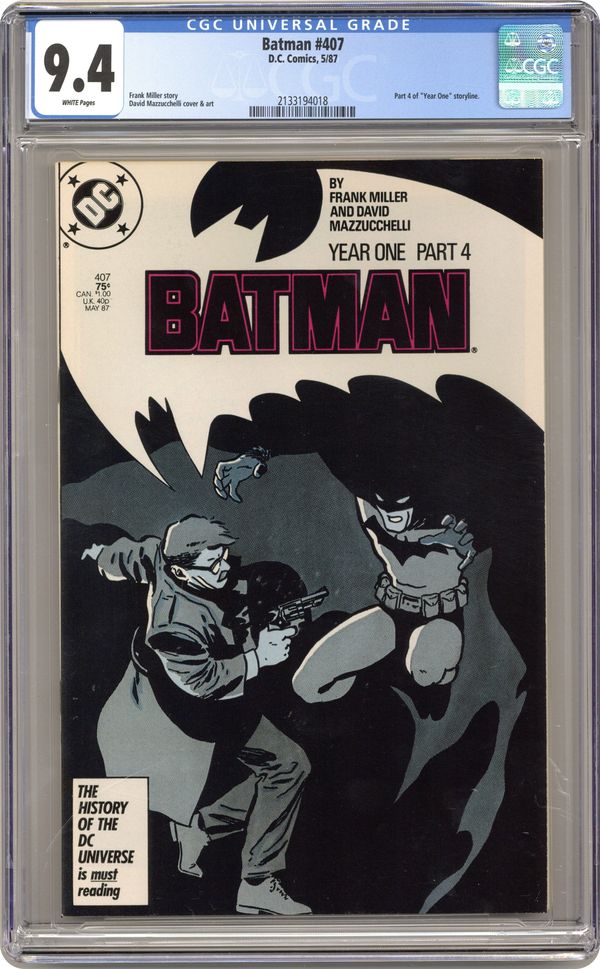 Ended Jan 12 2021 Winning Bid $25 Batman Year One, Chapter Four: "Friend In Need". Part 4 of 4, continued from the previous issue. James Gordon is blackmailed, Catwoman gets in Batman's way and Bruce Wayne must come to the rescue sans cape and cowl. Script by Frank Miller, art by David Mazzucchelli. Mazzucchelli cover. 1st printing. NOTE: Most issues from 397-432 were reprinted in 1989 and sold in multipacks. These 2nd and 3rd prints have back cover ads dated 1989. 36 Pages, Full Color. Cover price $0.75. Grade: CGC 9.4 explanation of grade Condition: Used (collectible)