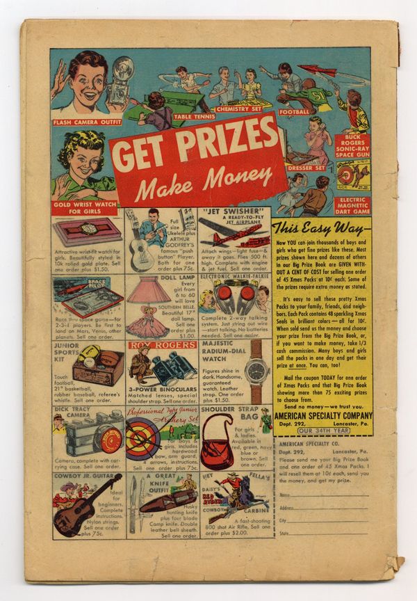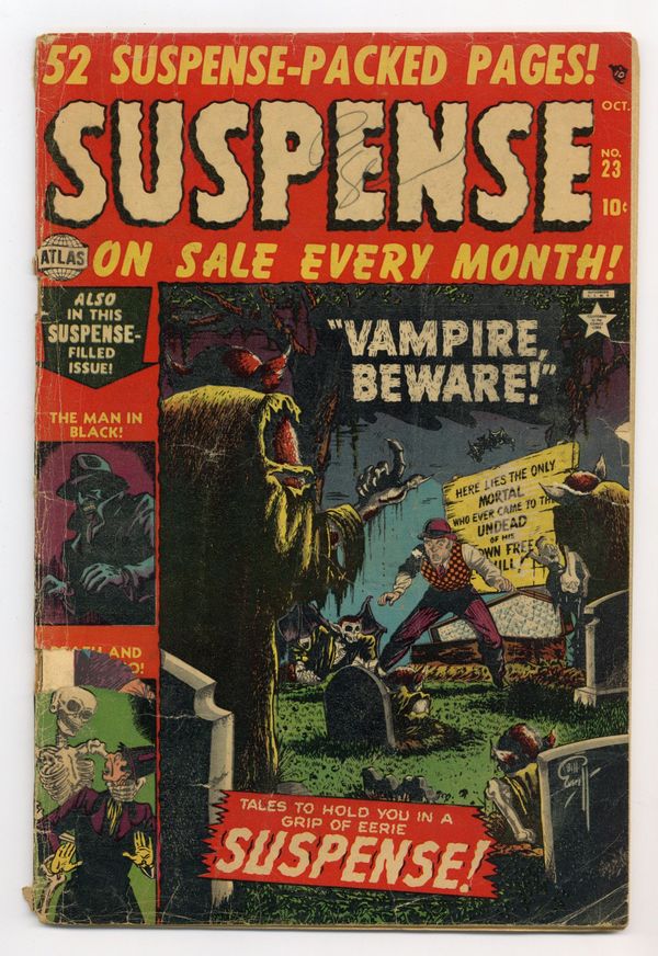 Cover art by Bill Everett. Molu's Secret!, script by Stan Lee, art by Carmine Infantino. Death and Mr. Marko, art by Joe Sinnott. Vampire, Beware!, script by Stan Lee, art by Bill Everett. The Return Trip, art by Cal Massey. The Man in Black, art by Sy Grudko. The Ugly Man, script by Stan Lee, art by Joe Maneely. Skin-Deep, art by Syd Shores. 52 pgs. $0.10. Cover price $0.10. Grade: GD 2.0 explanation of grade Condition: Used (collectible)