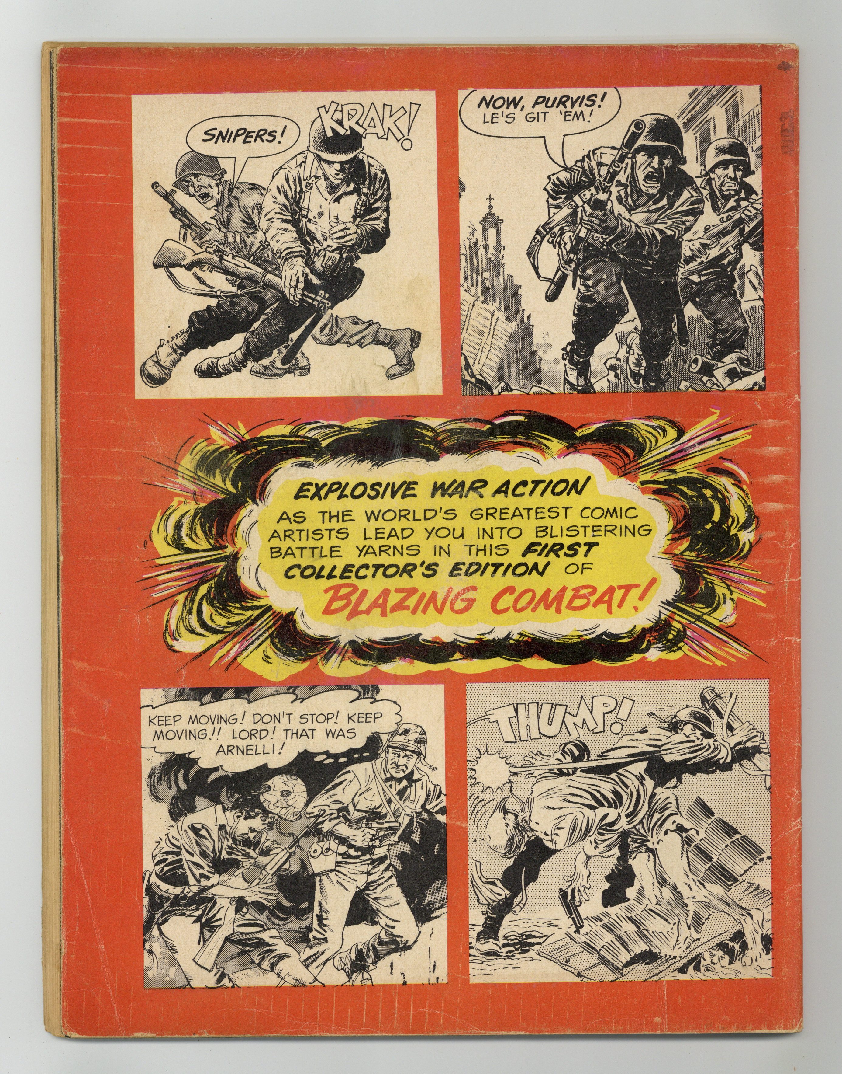 Blazing Combat, which evokes Harvey Kurtzman's Two-Fisted Tales and Frontline Combat, was a short-lived, though critically acclaimed series edited (and mostly written) by Archie Goodwin. The first issue includes the following stories, each of which was written by Archie Goodwin: Viet Cong (art by Joe Orlando); Aftermath! (art by Angelo Torres); Flying Tigers! (art by George Evans); Cong View! (art by Gray Morrow); Cantigny! (art by Reed Crandall); Mad Anthony! (art by Russ Jones, Tex Blaisdell, and Maurice Whitman); and Enemy! (art by John Severin). Cover art by Frank Frazetta. Cover price $0.35. Grade: GD/VG 3.0 explanation of grade Condition: Used (collectible)