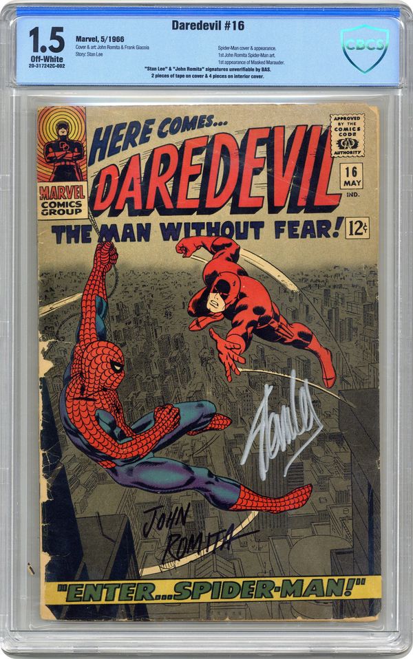 "Stan Lee" & "John Romita" signatures unverifiable by BAS. 2 pieces of tape on cover & 4 pieces on interior cover.