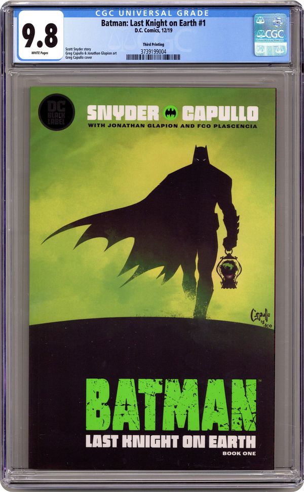 Ended Apr 15 2021 Winning Bid $49 3rd Printing. Written by Scott Snyder. Art by Greg Capullo and Jonathan Glapion. Cover by Greg Capullo. Bruce Wayne wakes up in Arkham Asylum. Young. Sane. And...he was never Batman. So begins this sprawling tale of the Dark Knight as he embarks on a quest through a devastated DC landscape featuring a massive cast of familiar faces from the DC Universe. As he tries to piece together the mystery of his past, he must unravel the cause of this terrible future and track down the unspeakable force that destroyed the world as he knew it… From the powerhouse creative team of writer Scott Snyder and artist Greg Capullo, the team that reinvented Batman from the emotional depths of 'Court of Owls' to the bombastic power of DARK NIGHTS: METAL, DC Black Label is proud to present the bimonthly, three-issue miniseries BATMAN: LAST KNIGHT ON EARTH, published at DC's standard comic trim size. This could be the last Batman story ever told… 52 pages, full color. Mature Readers Cover price $5.99. Grade: CGC 9.8 explanation of grade Condition: Used (collectible)