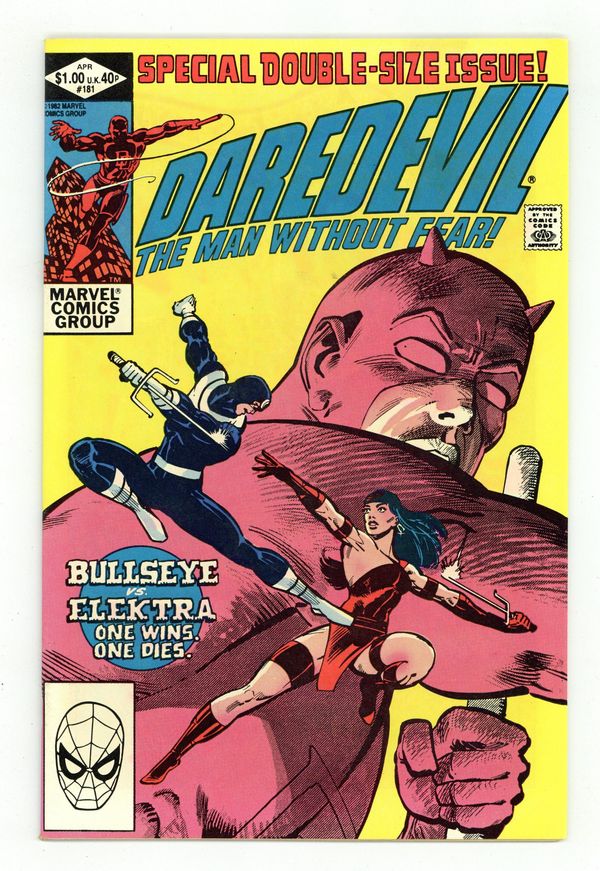 Ended Dec 20 2021 Winning Bid $133 Direct Edition. Cover pencils by Frank Miller, inks by Klaus Janson. Last Hand, script by Frank Miller, pencils by Frank Miller (breakdowns) and Klaus Janson (finished art), inks by Klaus Janson; Bullseye breaks out of prison; Elektra hunts down Foggy and is about to kill him until she recognizes him as Matt's buddy from college; Bullseye fights Elektra and kills her with her own sai; DD goes after Bullseye and ends up dropping him from a great height, breaking every bone in his body; Kingpin appearance; story narrated by Bullseye; story dedicated to the memory of Wally Wood 1927-1981. Full page pin-up ad for Marvel Fanfare, art by Michael Golden. Statement of Ownership average # of copies in preceding 12 months: 276,812 Cover price $1.00. Grade: VF+ 8.5 explanation of grade Condition: Used (collectible)