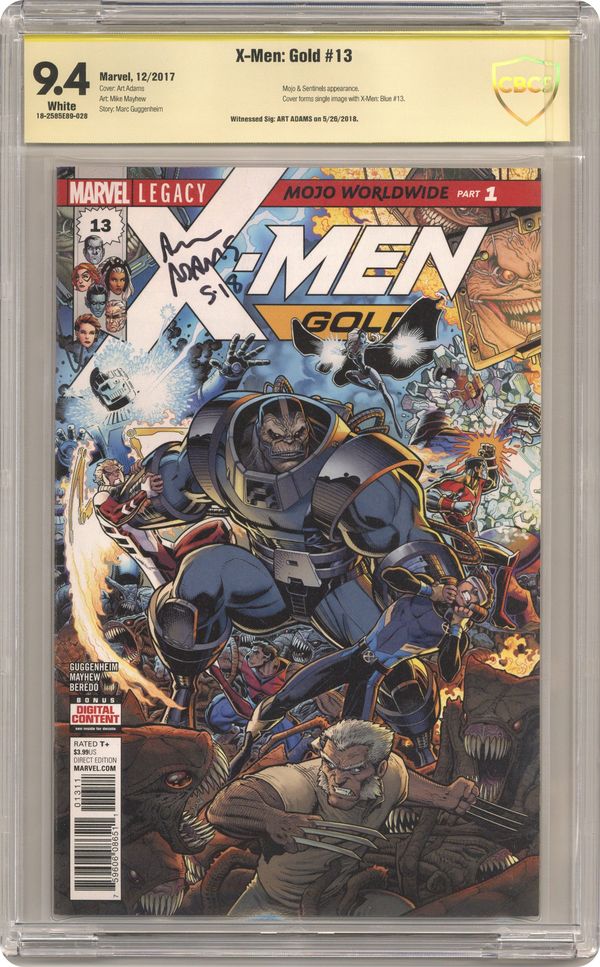 Mojo Worldwide: Part 1 - Written by Marc Guggenheim. Art by Mike Mayhew. Cover by Arthur Adams. Mojo, the demented creature obsessed with melding deadly television shows with reality, has made Earth his focus and it's going to take the combined might of two X-MEN teams to fight back! But when threats from their past are thrown at them, how will these teams react? With SENTINELS and BROOD and BAD MEMORIES attacking at every opportunity, will KITTY and JEAN and their teams be able to save Manhattan? Or is this the trick that finally boosts MOJO's ratings? PLUS: Includes 3 bonus MARVEL PRIMER PAGES! Story by Robbie Thompson and art by Mark Bagley! Story continues in X-Men Blue (2017) #13. 36 pages, full color. Rated T+ NOTE: Includes Marvel Value Stamp #8 of 53: Phoenix. Cover price $3.99. Grade: CBCS 9.4 explanation of grade Condition: Used (collectible)